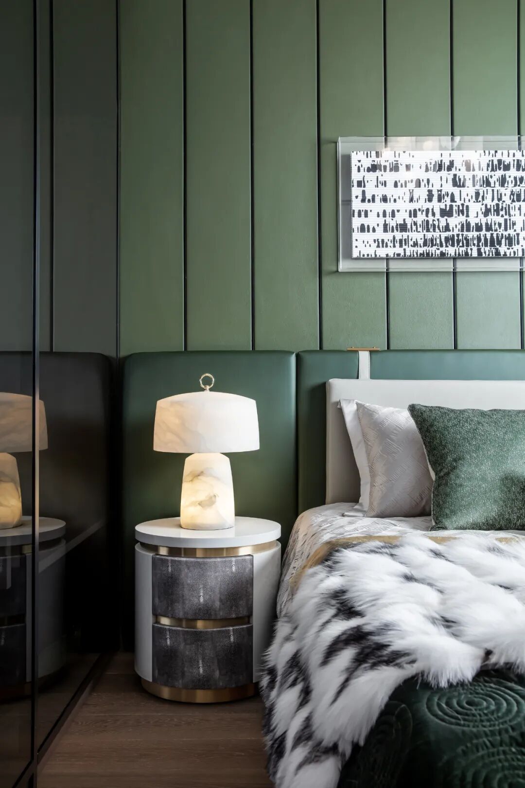 主卧作为拥有单独动线与内玄关的江景套房,拥有着与客餐厅同样朝向、尺度的观景台。在暗纹影木与钢琴漆面的内敛平静中,独享景观界面的旷达之境。