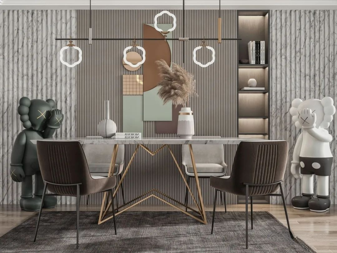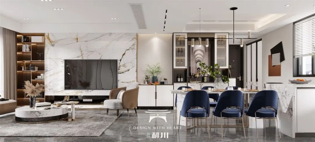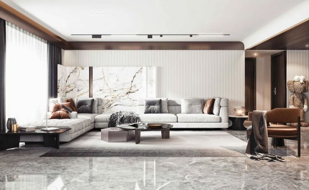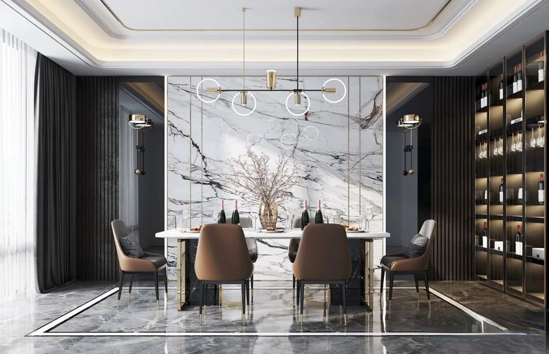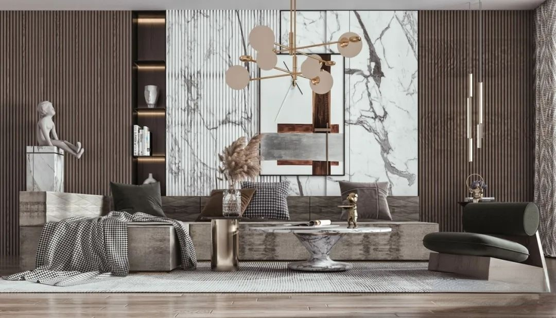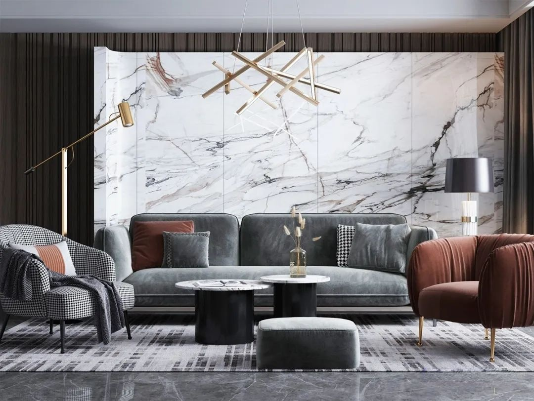 天然大理石纹理天然,质感细腻,能完美地与木质、金属等异材质的家具进行搭配。与木质家具搭配能够呈现出刚与柔的对比关系,为家增添自然韵律。