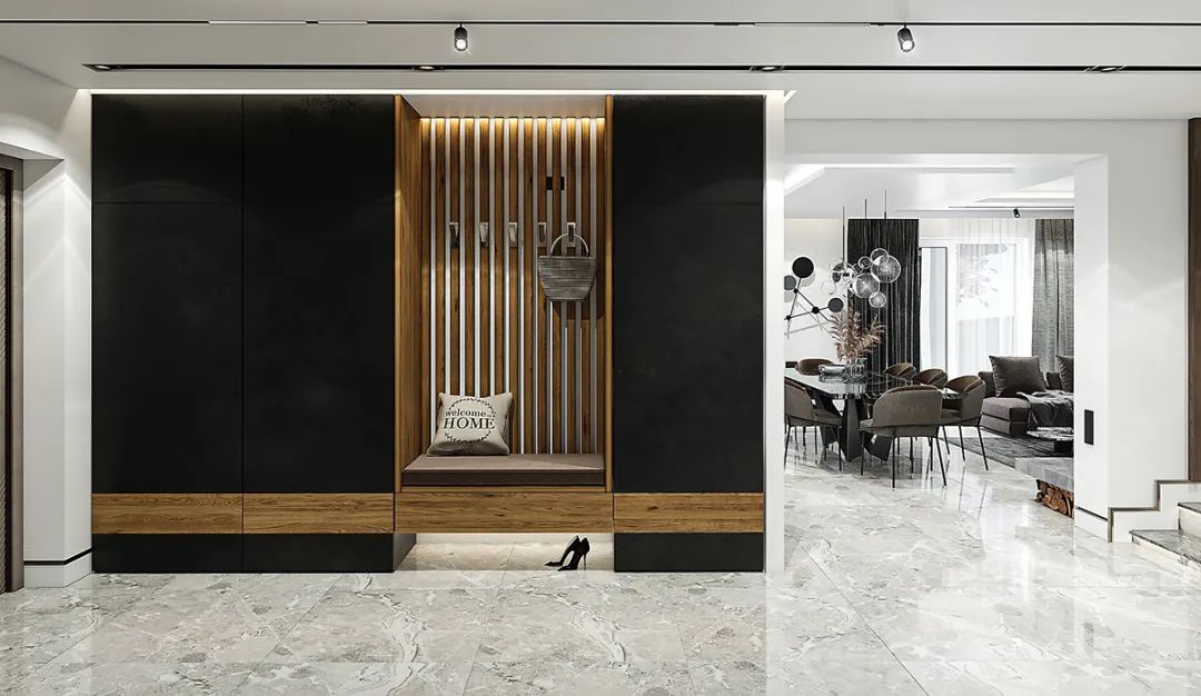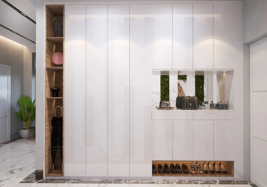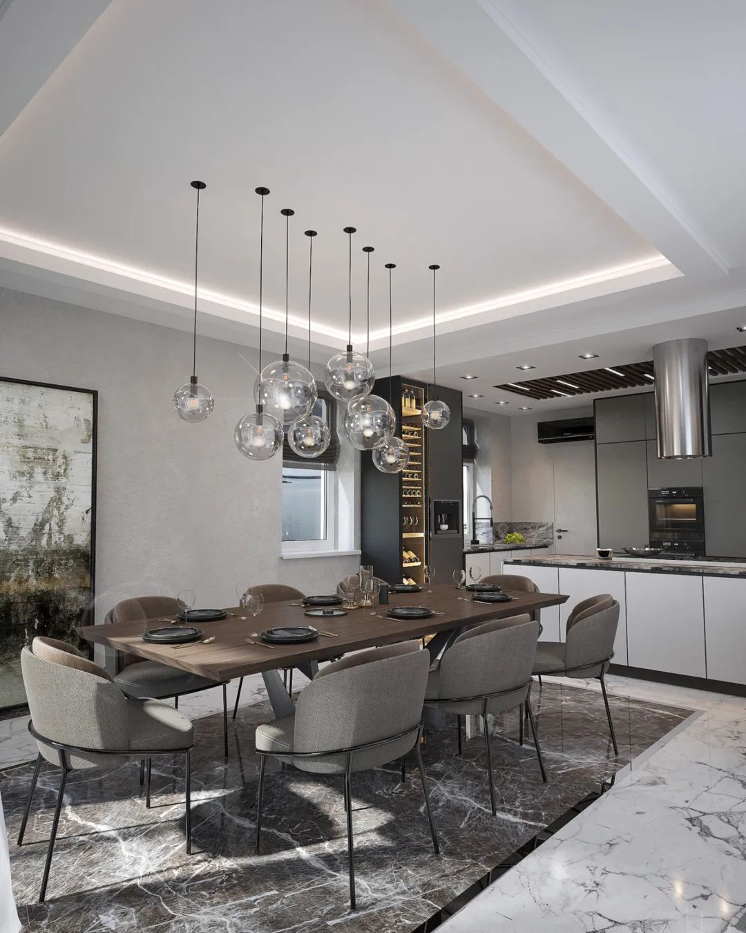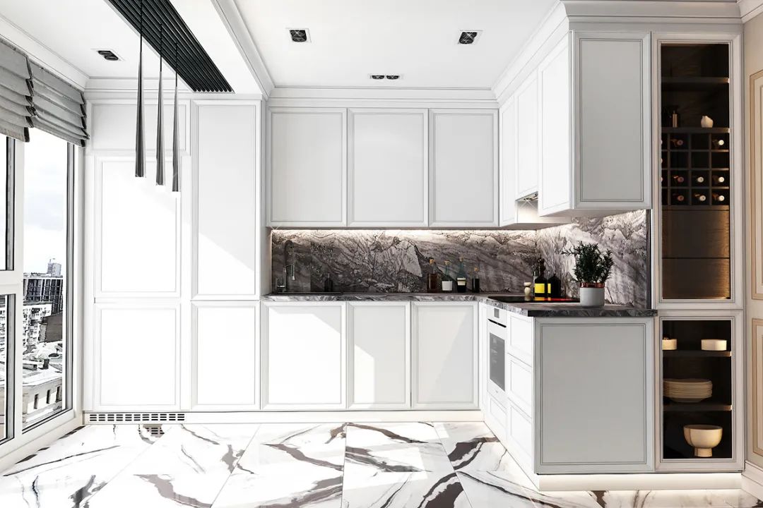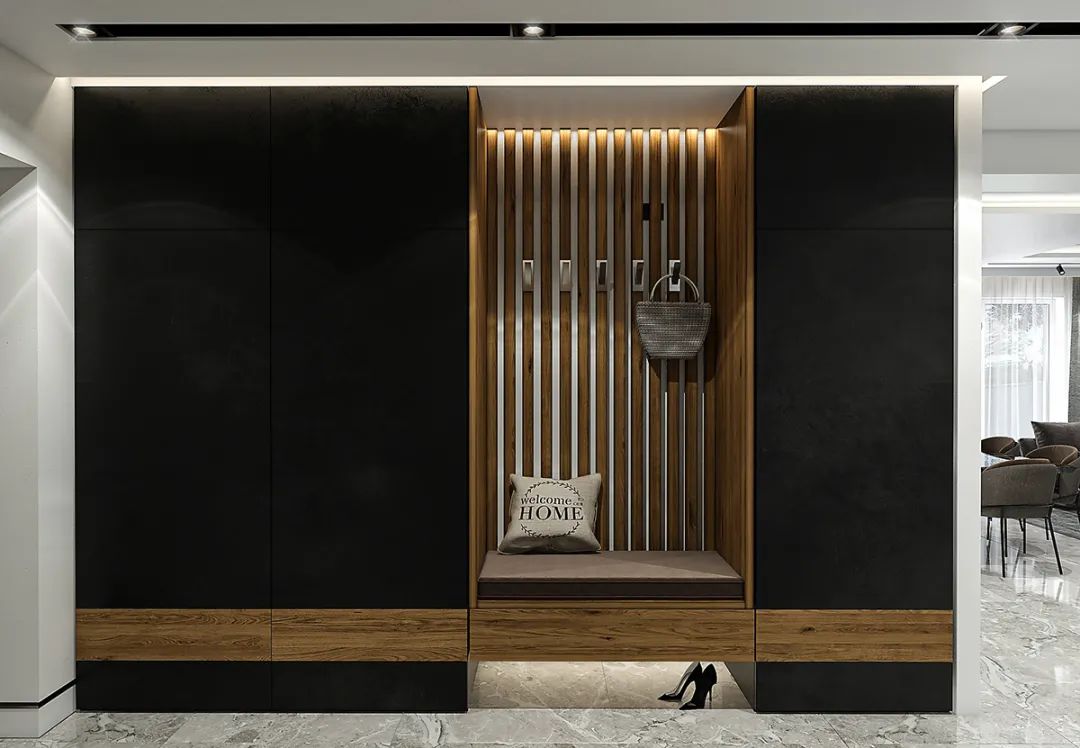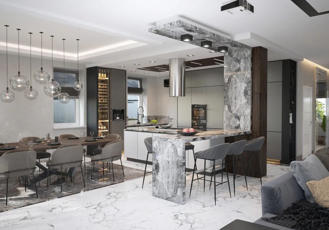 整体的空间打造采用极简的设计风格,通过用大理石搭配黑白灰来体现空间的高级感,体现出了设计师丰厚的设计美学底蕴。