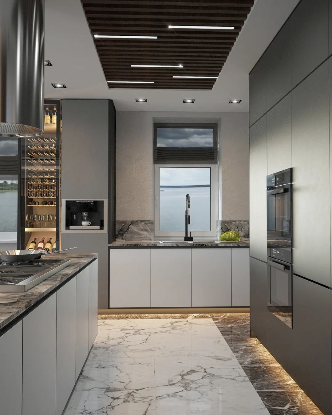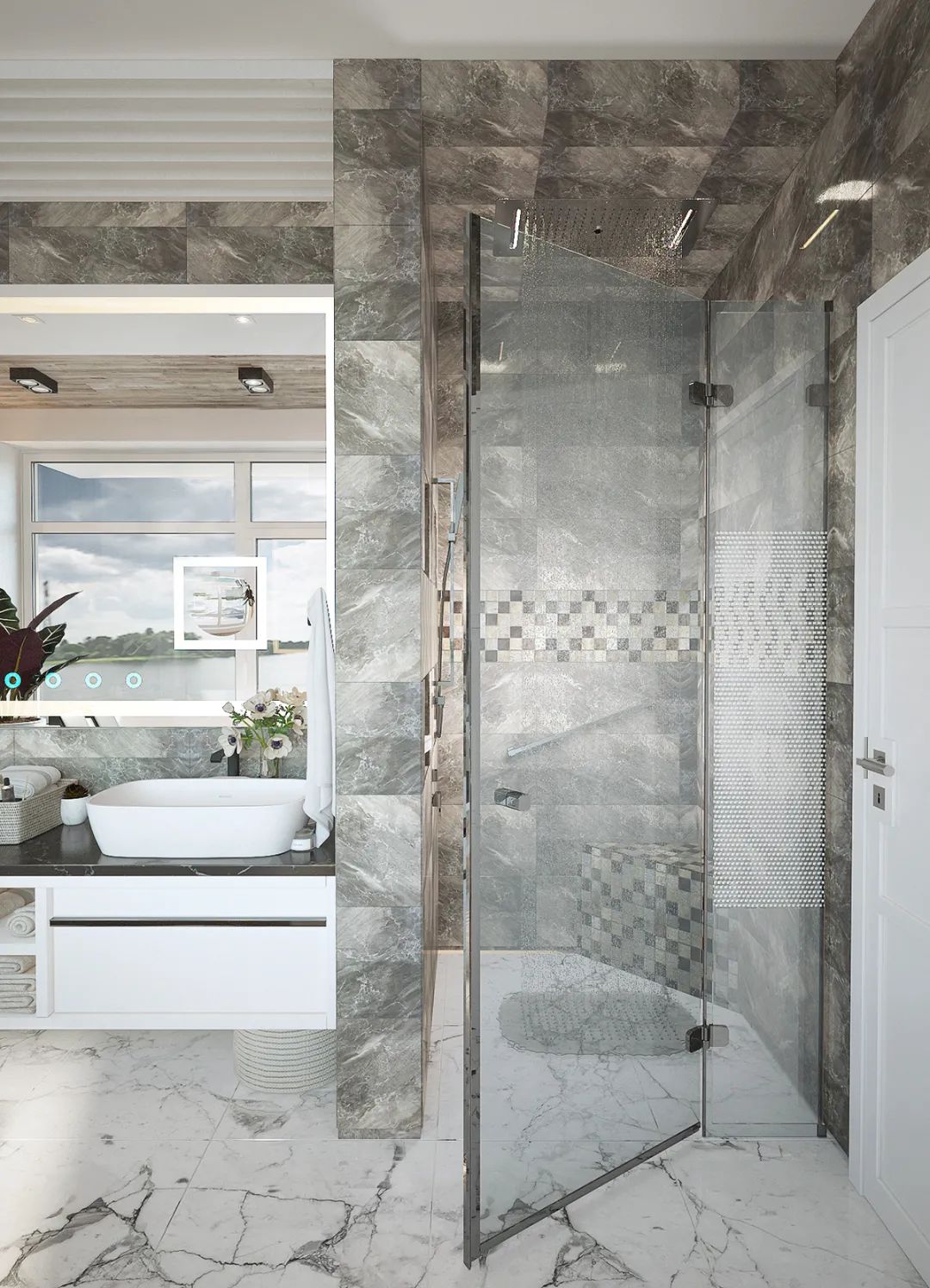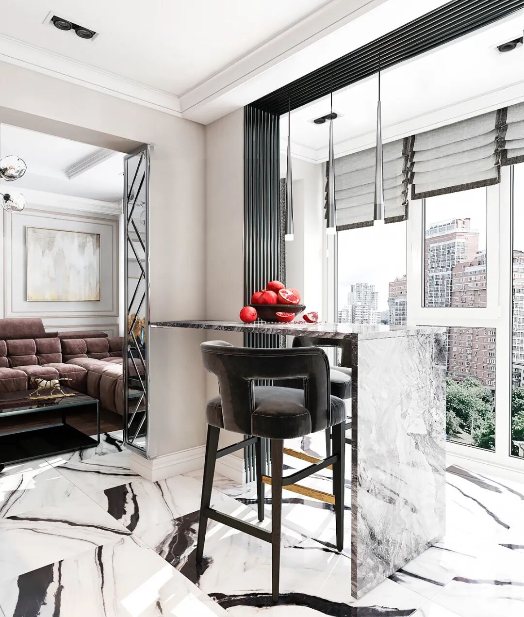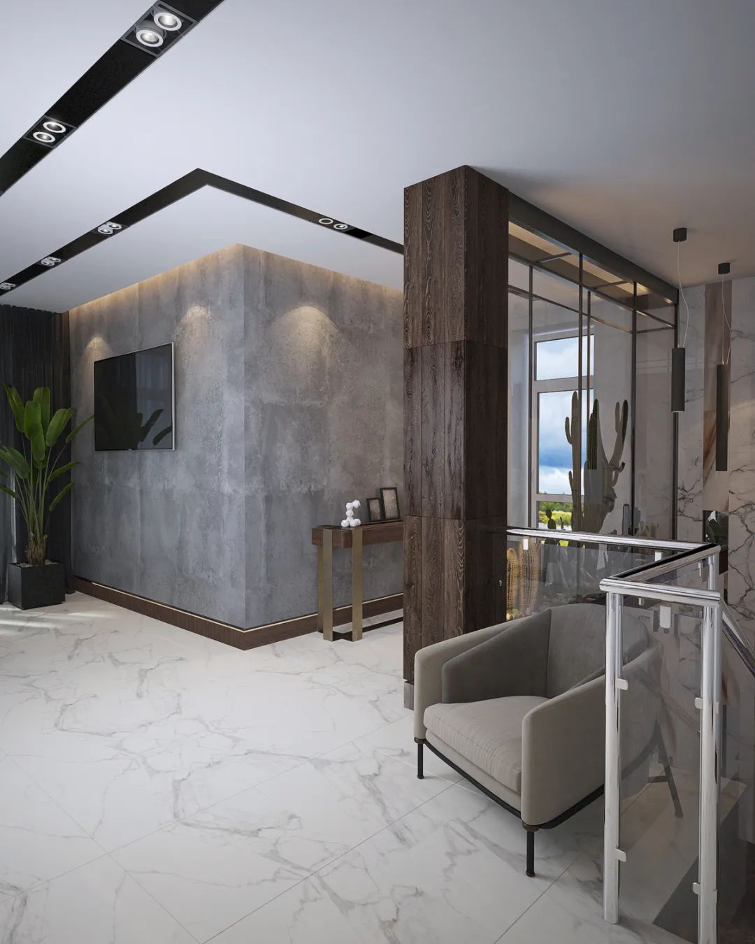 整体的空间打造采用极简的设计风格,通过用大理石搭配黑白灰来体现空间的高级感,体现出了设计师丰厚的设计美学底蕴。
