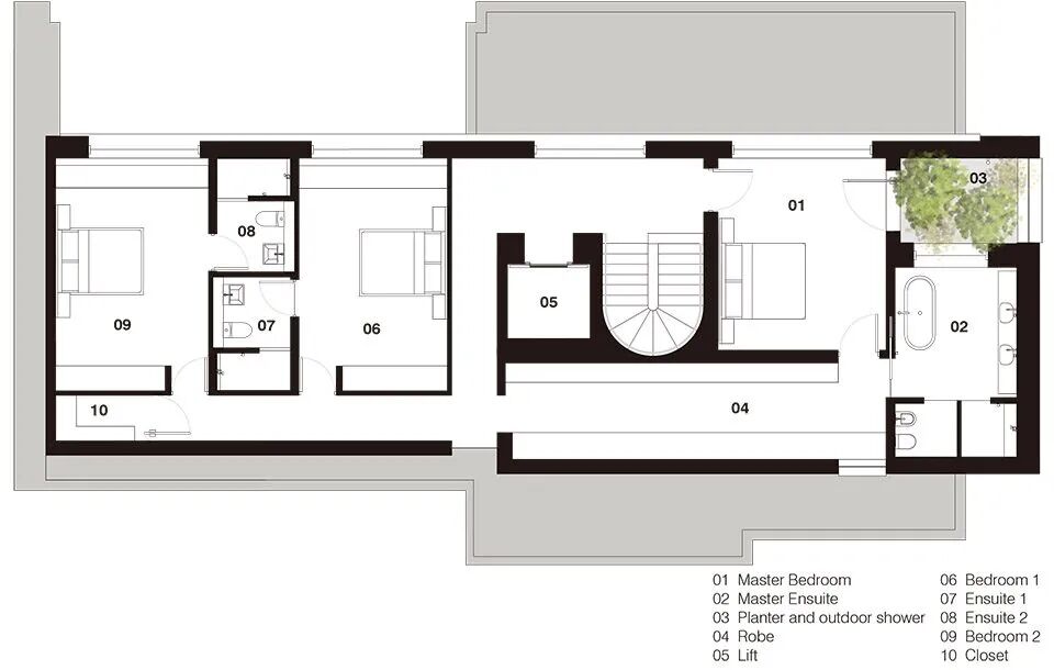相比于其他住宅空间,该建筑更注重于一对夫妻所有者的生活和习性。配套齐全的大型卧室套房连接日式隐蔽花园中的户外淋浴。