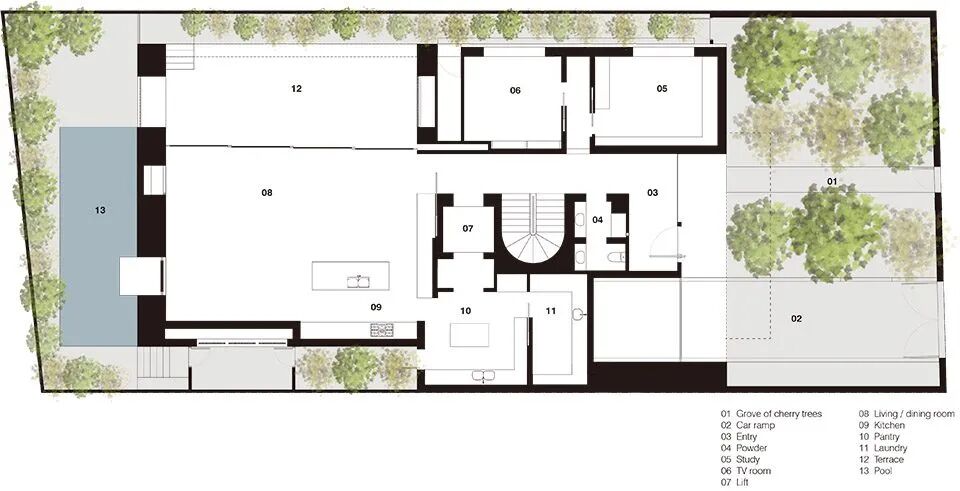 住宅设计呼应全局,将室内设计与花园配景相结合。户外花园中的绿植分层规划,私人篱笆外墙与建筑外侧街道之间种植灌木以保证建筑的私密性。