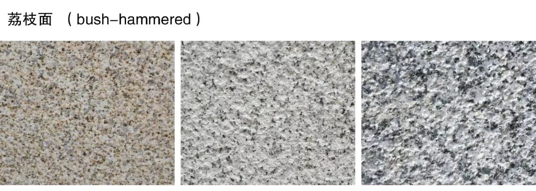 (5)荔枝面(bush-hammered):表面粗糙,凹凸不平,是用凿子在表面上密密麻麻的凿出小洞,有模仿水滴经年累月的滴在石头上的一种效果。