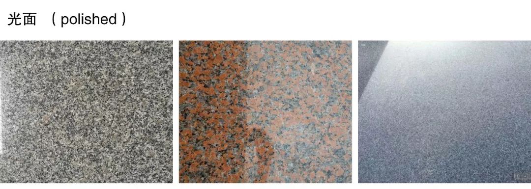 (3)光面(polished):表面非常的平滑,高度研磨抛光,有高光泽的镜面效果。花岗岩、大理石和石灰石通常含天然晶体,经抛光处理这些晶体反射光线而使石材表面有光泽,但需要不同的维护方式以保持其光泽。