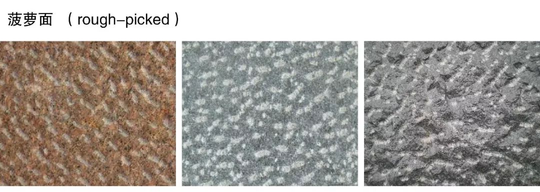 (8)菠萝面(rough-picked):菠萝面是在石材表面用凿子和锤子敲击成外观形如菠萝皮的板材。菠萝面比荔枝面和龙眼面粗犷。分细还可分为粗菠萝面和细菠萝面。