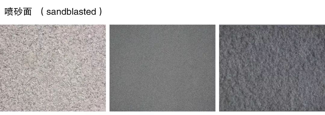 (12)喷砂面(sandblasted):用普通河沙或者是金刚沙来代替高压水来冲刷石材的表面,形成有平整的磨砂效果的装饰面。