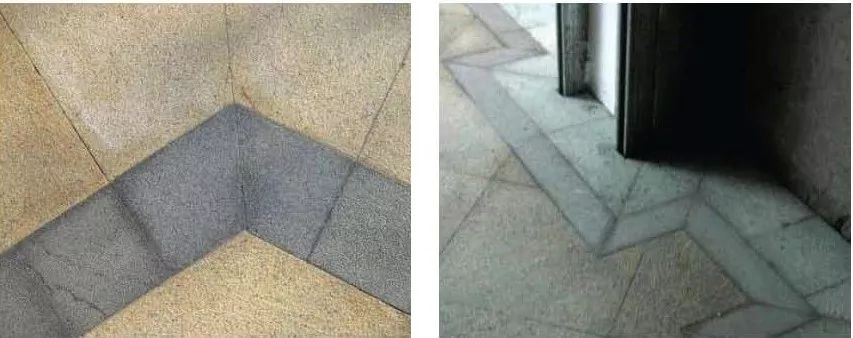 重要节点铺装排版时,图上放样和实地放样相结合。无法满足所有板材套用模数时,可在边角等较隐蔽部位出现45°对拼或大小板材,大面铺装板材规格应尽量统一,以降低施工难度。
