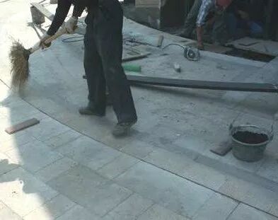 4、扫缝采用细沙或干灰,控制扫缝标高,观感均匀。