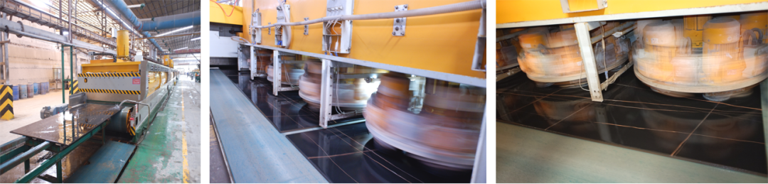 岩板抛光工序、清洗打磨(针对目前的仿古哑面,需对产品表面污垢进行抛面清洗,后进行磨边。在干粒面产品的程度上,需要通过抛光和超洁亮的程序后进行磨边。)