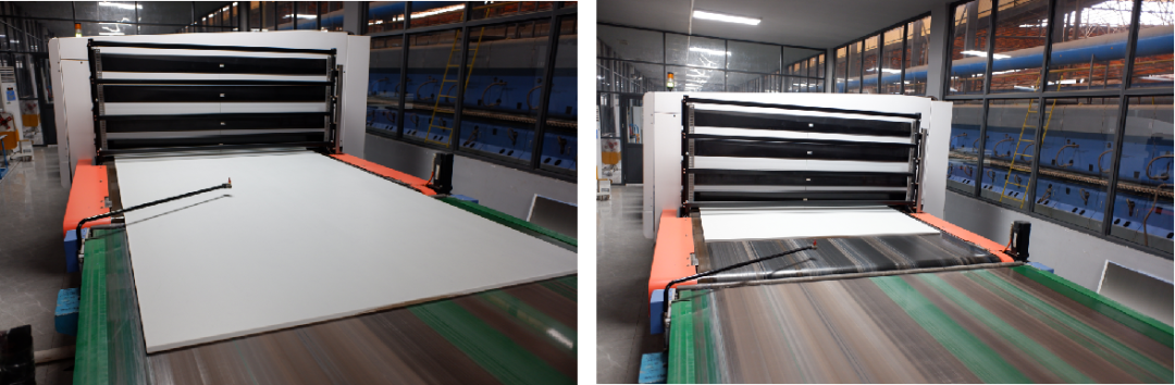 数码喷墨打印(拥有世界先进的陶瓷现代化生产设备——萨克米数码喷墨打印机,打破行业规格传统,终结传统瓷砖表面单调与实际应用狭窄的时代,让每一块岩板的工艺效果真正实现一石多面、随心切割等加工的装饰效果。保证釉层厚度均匀,平整度和通透度得到完美的提升,实现生产过程的全机械化和自动化)