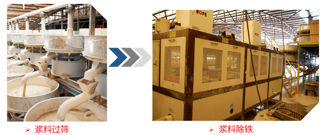 中转池过筛、浆料除铁(将泥浆过筛除铁处理,有效去除坯体杂质)