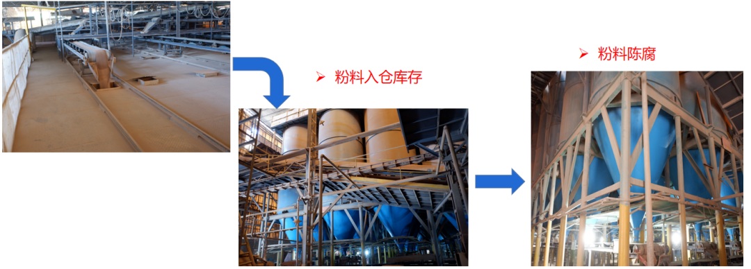 粉料储蓄和陈腐(粉料必须经过特定的时间做存储陈腐处理,保证水份和颗粒的稳定;粉料进入粉箱陈腐,确保质量稳定)
