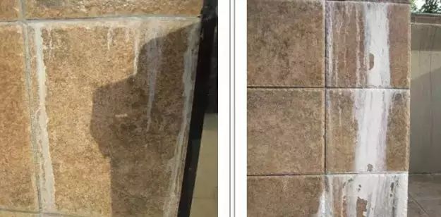 使用水泥作为粘接材料安装的石材,在长时间接触水、潮湿的前提下,水泥中的氢氧化钠、氢氧化钙等碱性物质,溶解到水中,并且沿着遍布石材的微孔、微裂隙结构,在毛细作用、和水的蒸腾作用力量带动下,被带往石材表面,析出。当这些碱性物质析出石材表面后。会随着时间的推移,发生两种变化: