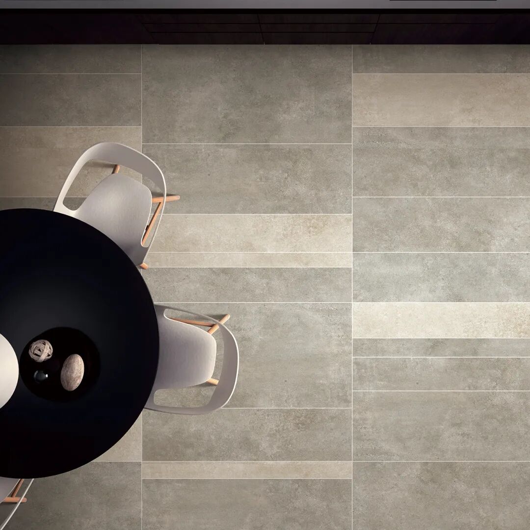 利用不同形状,不同颜色的瓷砖混合搭配,并列交替铺开,可以同宽也可以一宽一窄,呈现条纹式的空间效果。