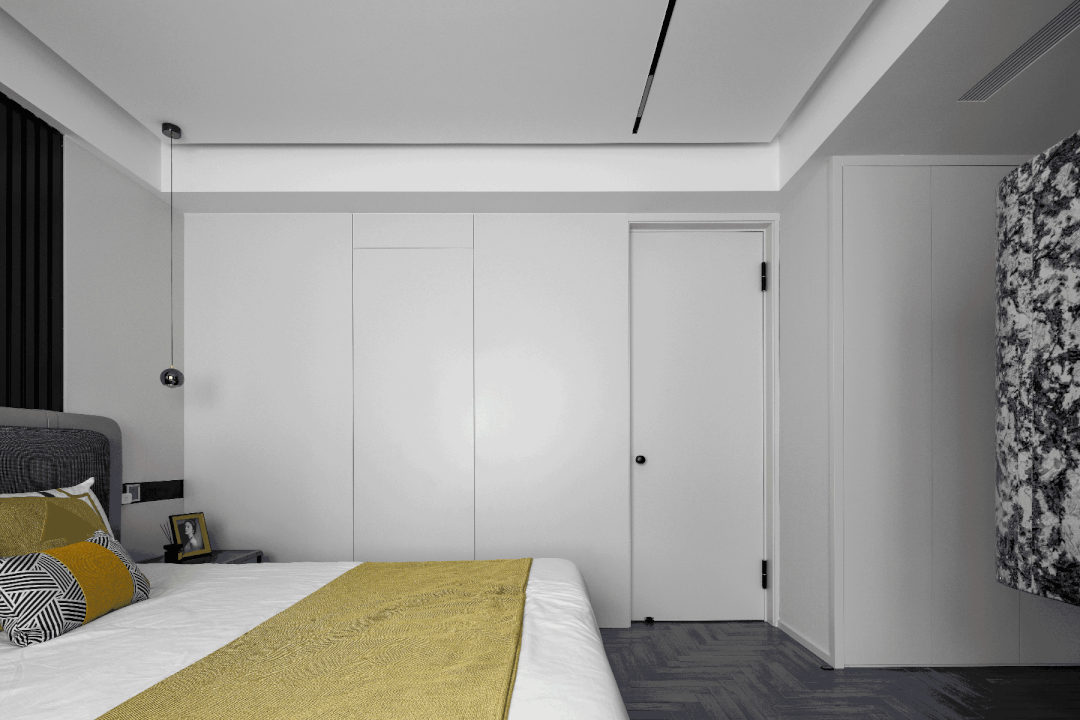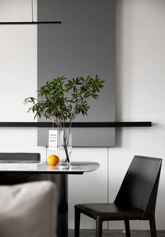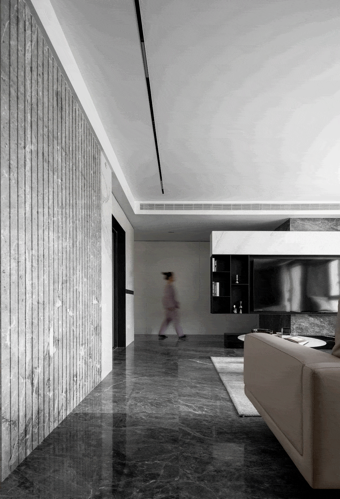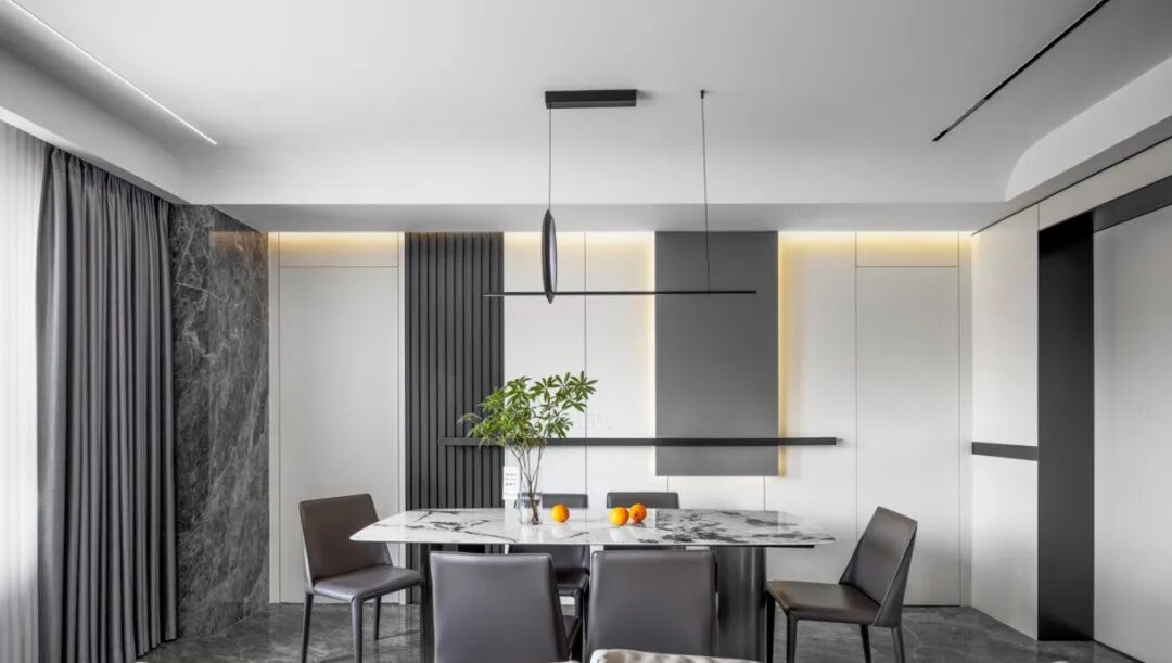 设计师以黑白灰为空间基调,辅之流云纹样大理石,缀以温暖的灯光,营造空间的质感美学,交织出一片安静天地。以简约艺术去雕刻家的模样,烘托出自在雅致的生活,给家更多温润沉稳的力量。