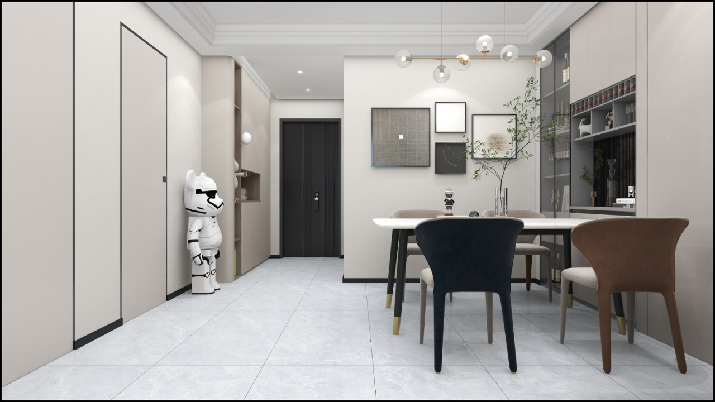 客厅地面通铺600*1200mm规格的瑞士冰灰,马可波罗瑞士冰灰灰色的质地上流动着白色的纹理,静静凝望,可以感受到阿尔卑斯山脉的绝美风景和冰川的静谧,自然神秘,搭配不规则的吊灯,这个客餐厅也活泼生动了起来。