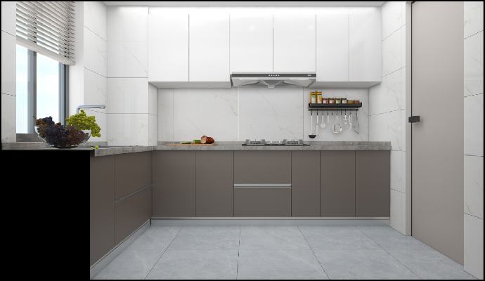 客餐厅地面用砖瑞士冰灰延伸至厨房,静谧深邃的色彩让本该充满油烟气的厨房通透干爽了起来,搭配白色的墙砖和吊柜,厨房看起来更加和谐统一,置身其中仿佛身处冰川之间,炎炎夏日有一种数不出的舒适安宁,下方深色储物柜设计,色彩上更有层次,也更具有实用性,方便收纳整理。