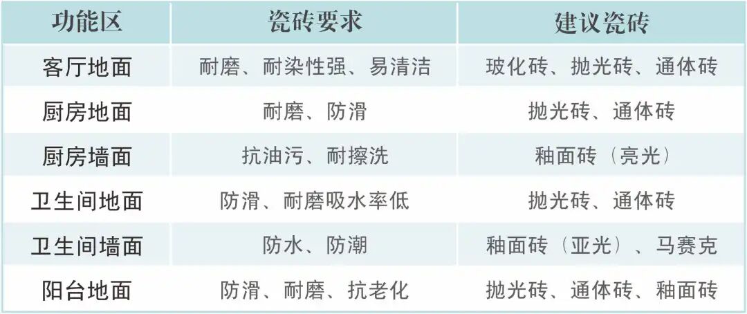 客厅、厨房、卫生间、阳台、过道…不同空间的功能不同,适合的瓷砖不一样。