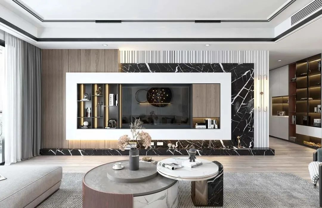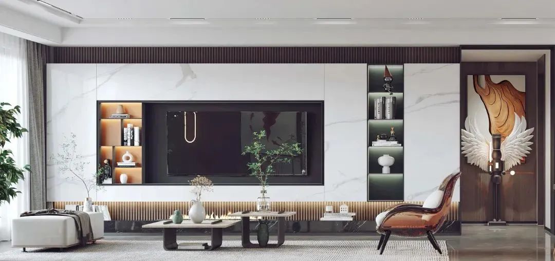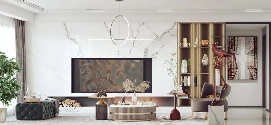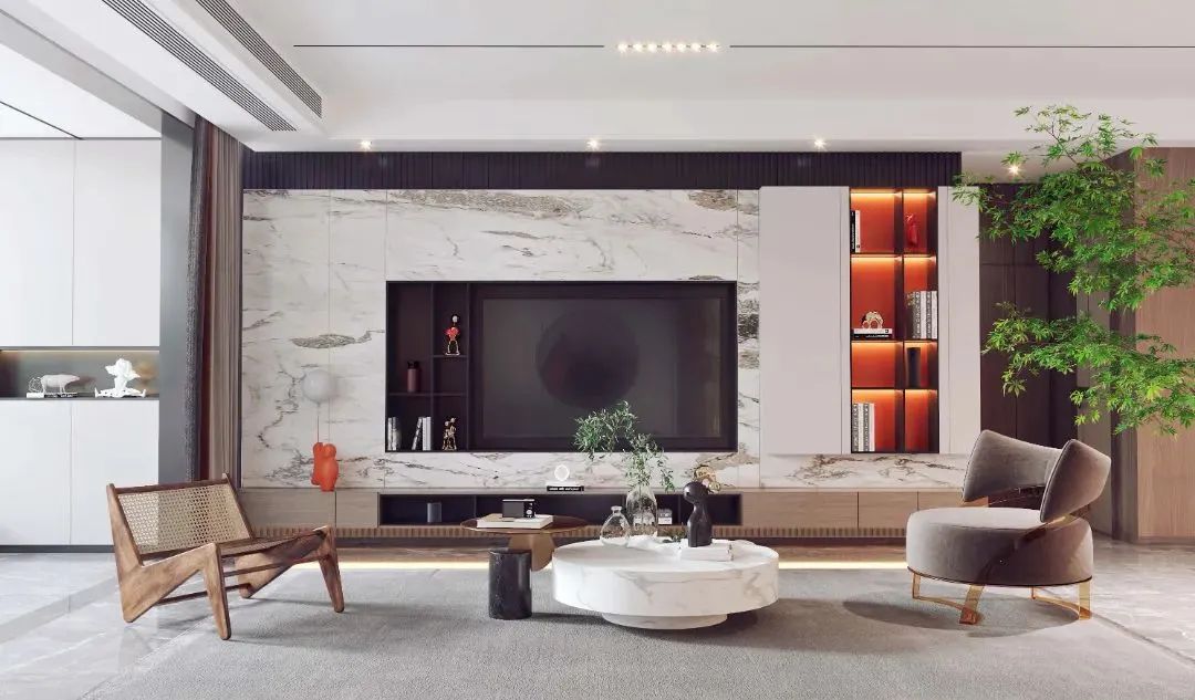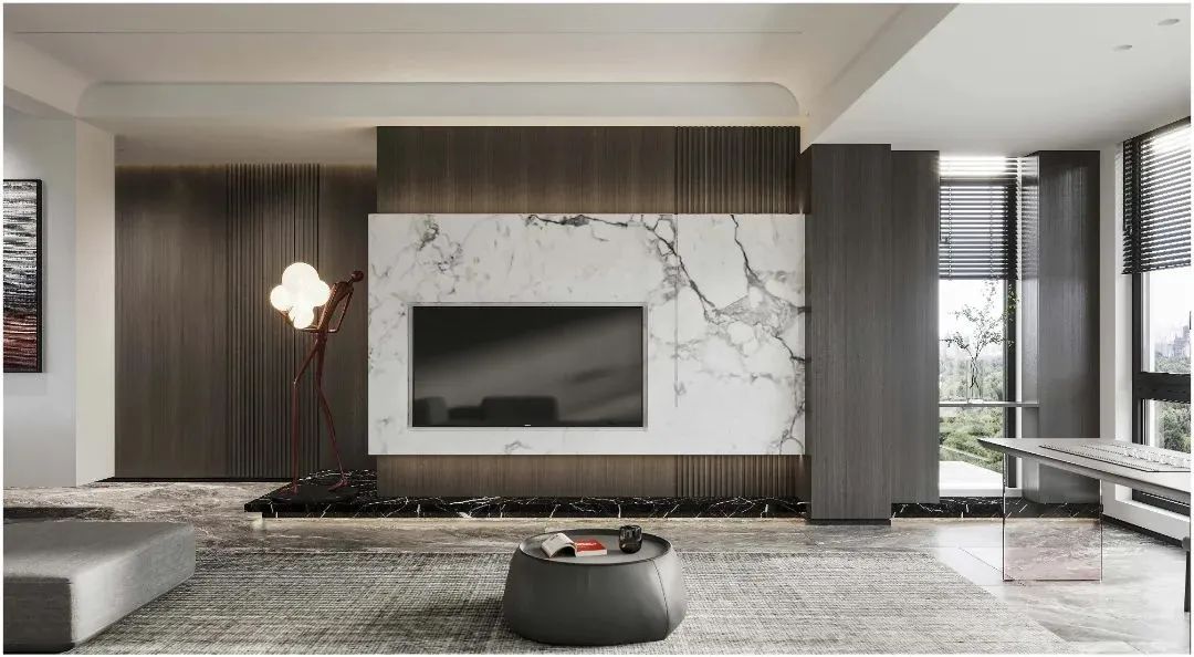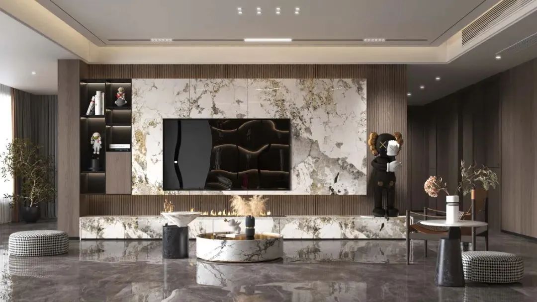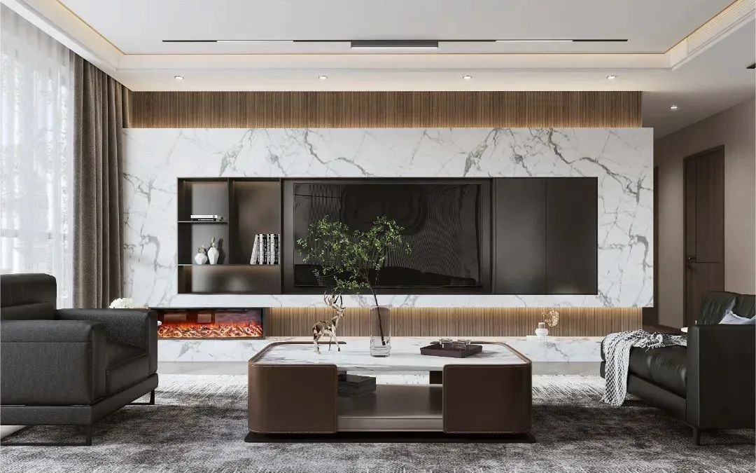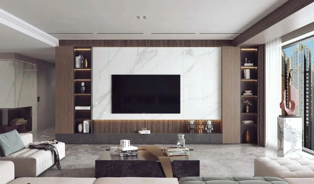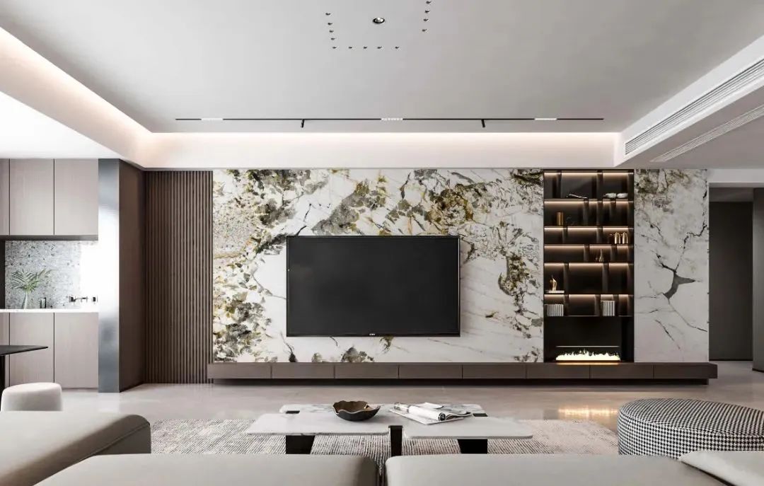 电视背景墙的颜值直接影响客厅的装饰效果,想要营造时尚又不失奢华的视觉效果,石材背景墙当仁不让。石材电视背景墙设计,功能繁多,可储物、可装饰,用在墙面的整体视觉上宽敞明亮,彰显家居环境的大气豪放。追求简约自然的业主可以试试木质+大理石的电视背景墙,可以凭借石材,配合灯带或者装饰展示柜体,美观又舒适。