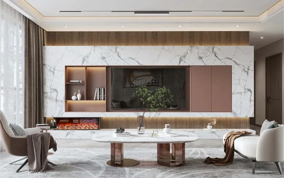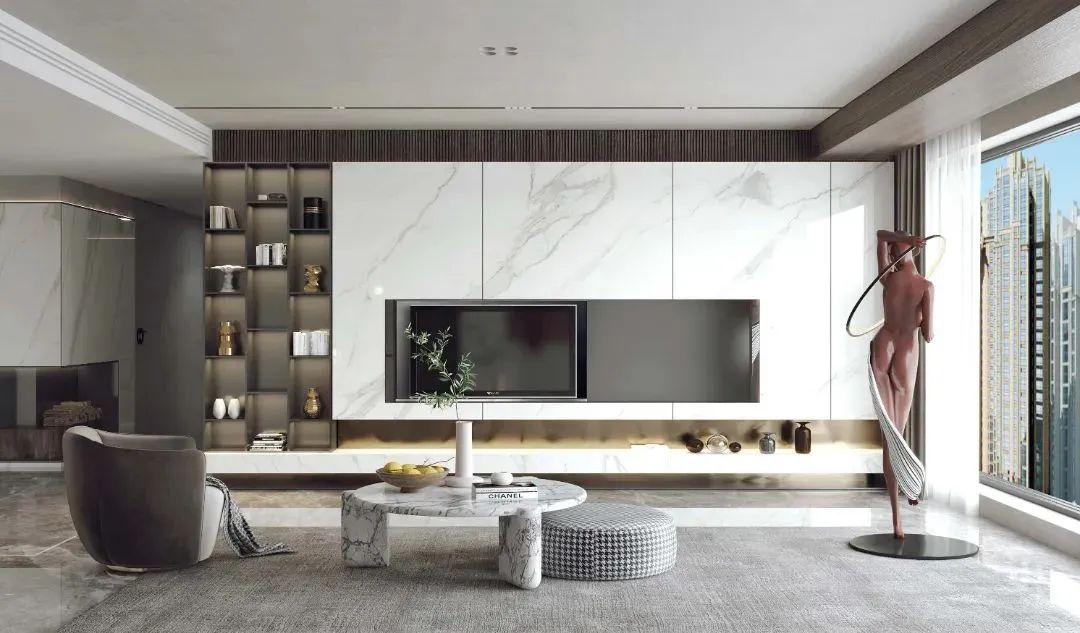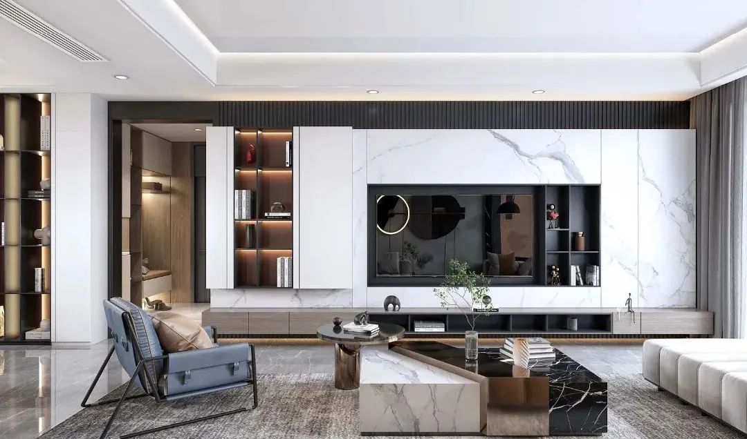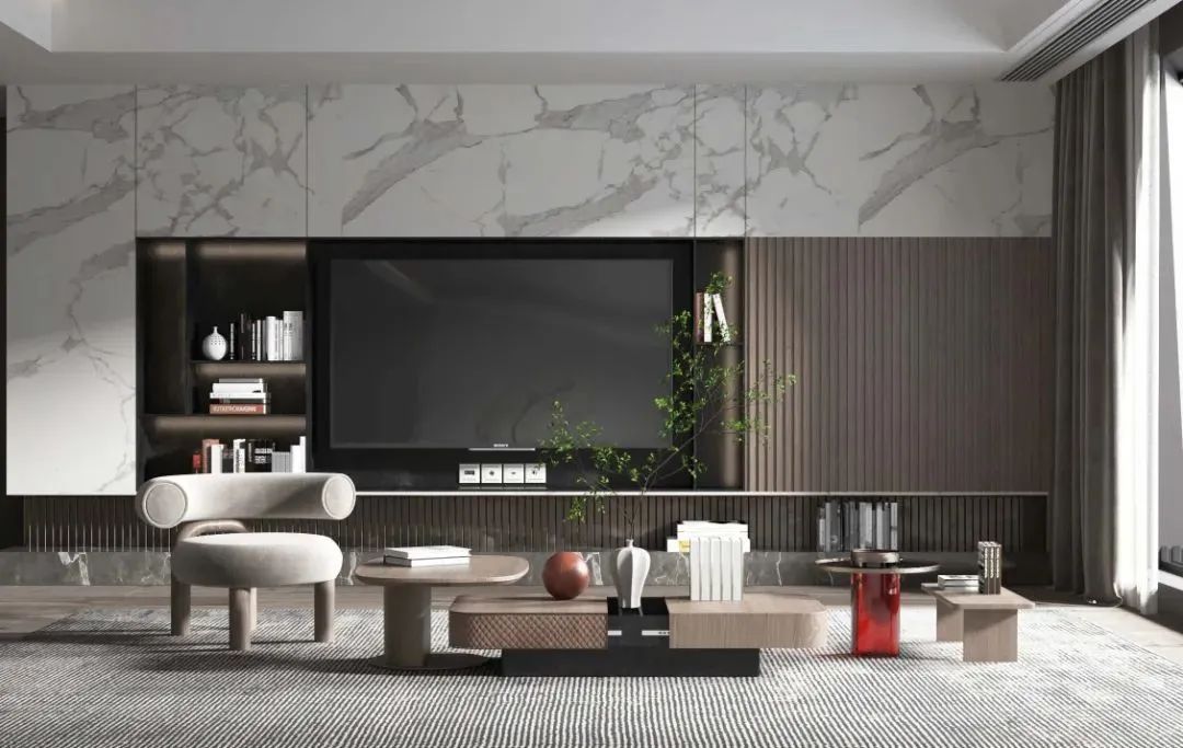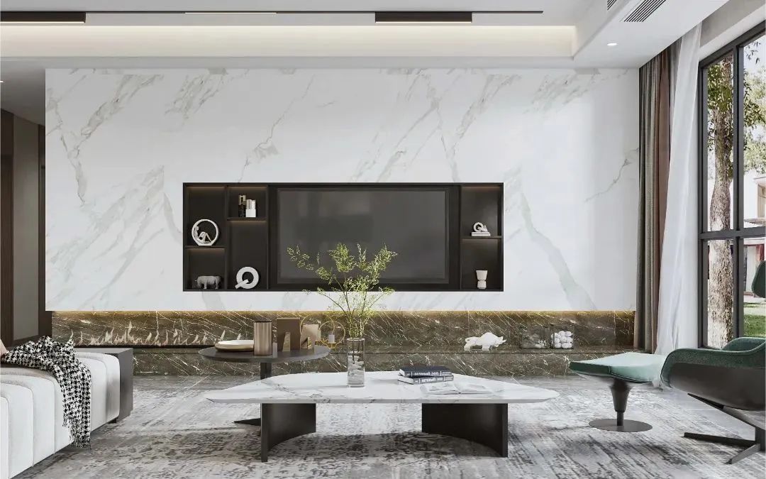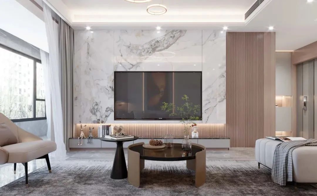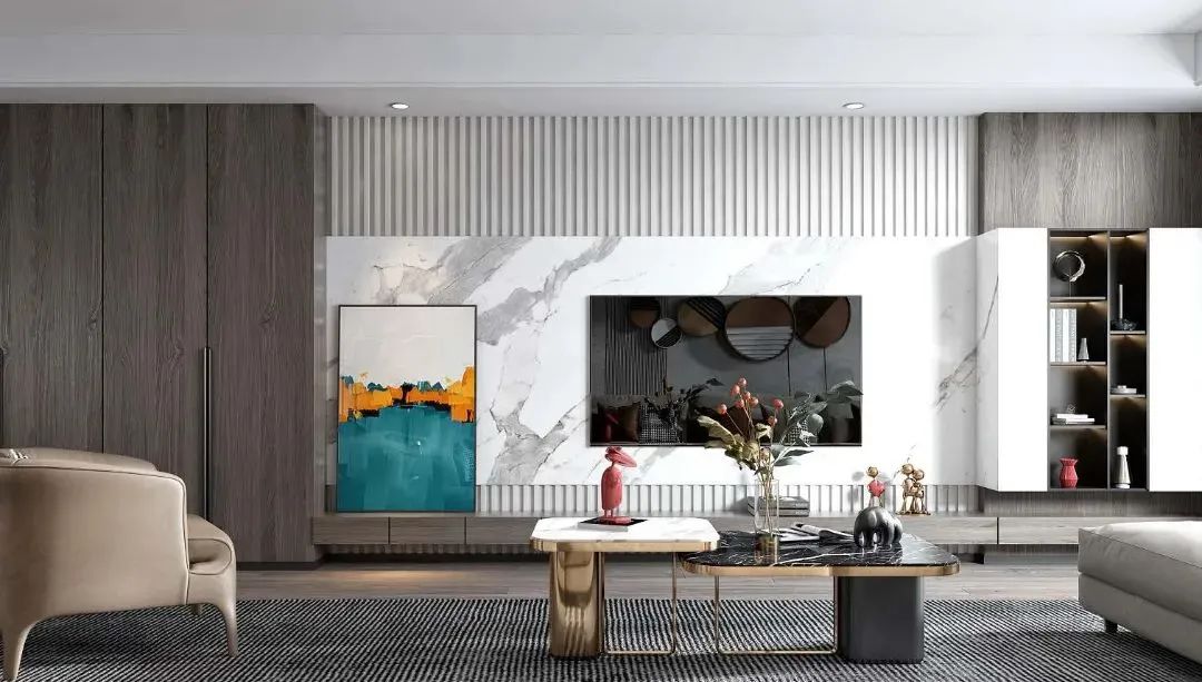 电视背景墙的颜值直接影响客厅的装饰效果,想要营造时尚又不失奢华的视觉效果,石材背景墙当仁不让。石材电视背景墙设计,功能繁多,可储物、可装饰,用在墙面的整体视觉上宽敞明亮,彰显家居环境的大气豪放。追求简约自然的业主可以试试木质+大理石的电视背景墙,可以凭借石材,配合灯带或者装饰展示柜体,美观又舒适。