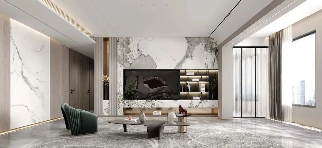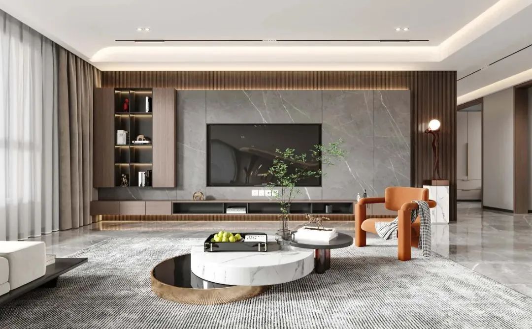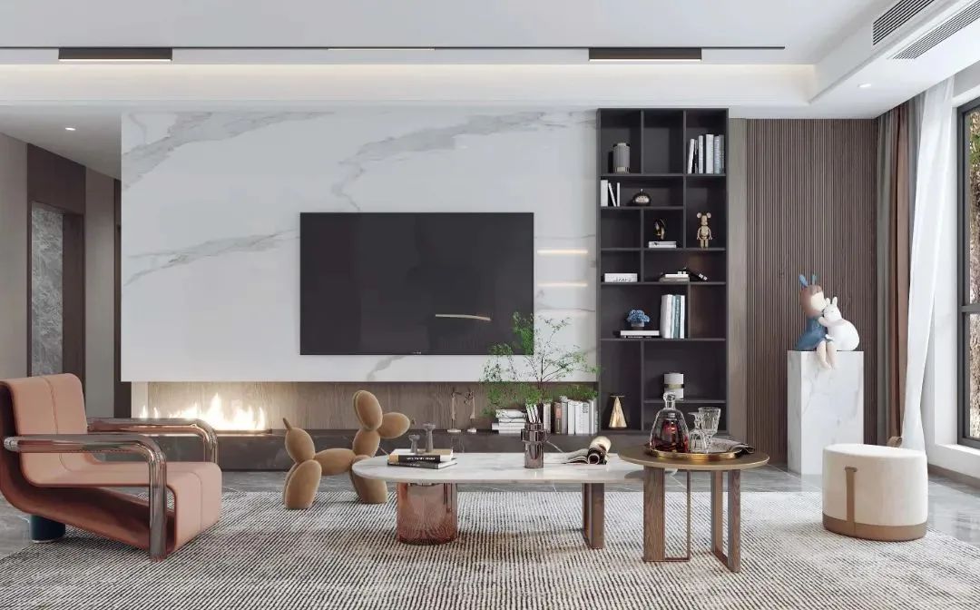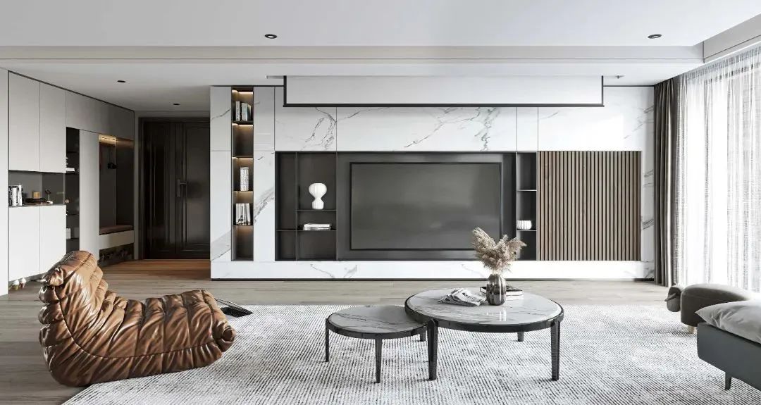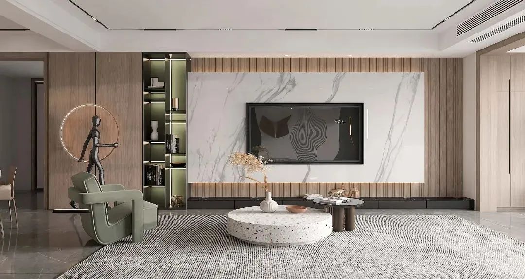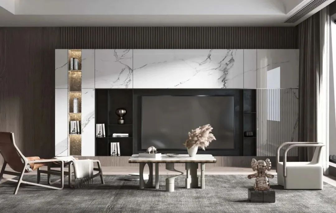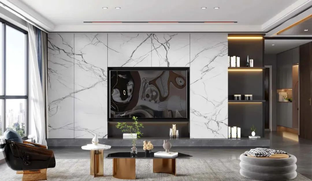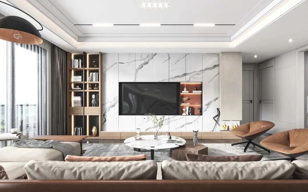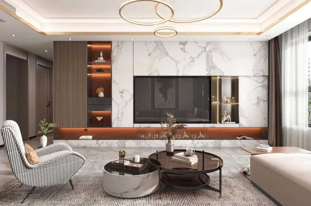 电视背景墙的颜值直接影响客厅的装饰效果,想要营造时尚又不失奢华的视觉效果,石材背景墙当仁不让。石材电视背景墙设计,功能繁多,可储物、可装饰,用在墙面的整体视觉上宽敞明亮,彰显家居环境的大气豪放。追求简约自然的业主可以试试木质+大理石的电视背景墙,可以凭借石材,配合灯带或者装饰展示柜体,美观又舒适。