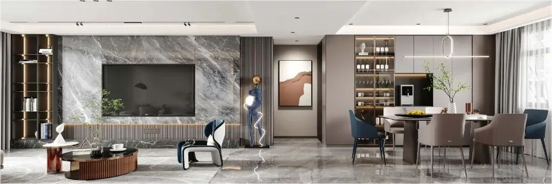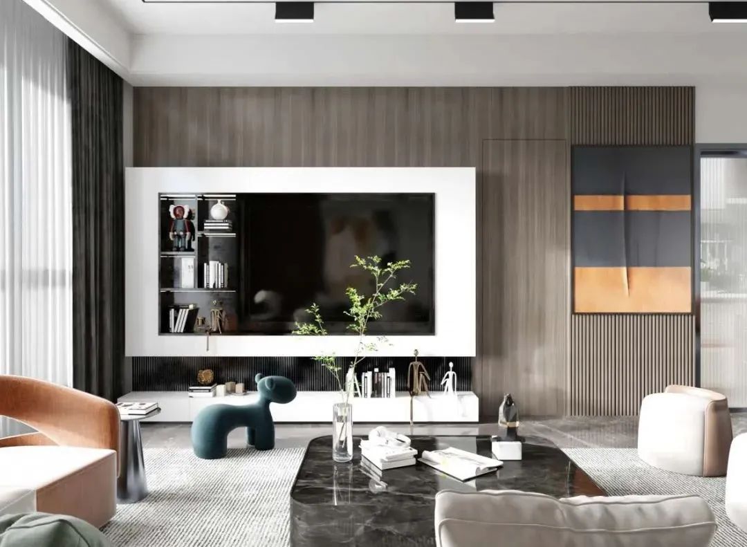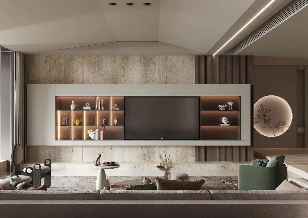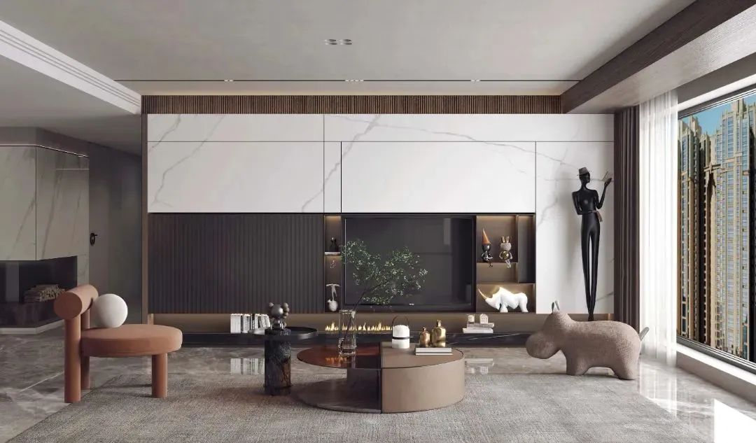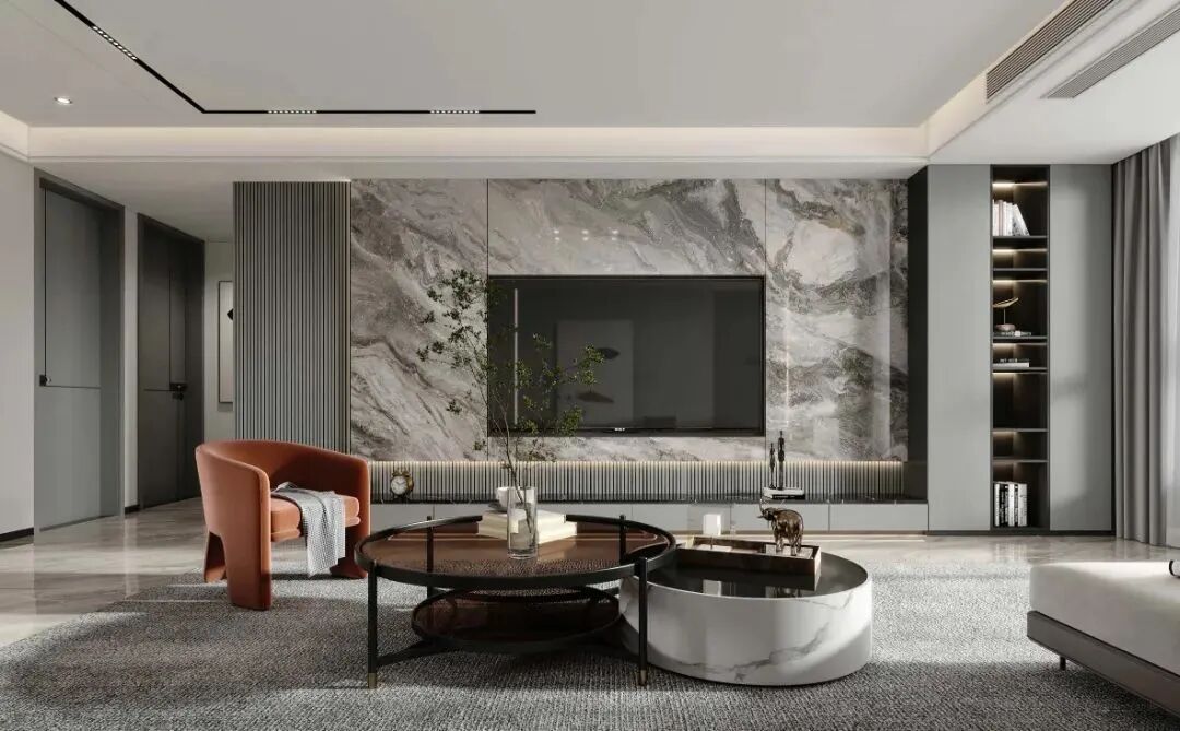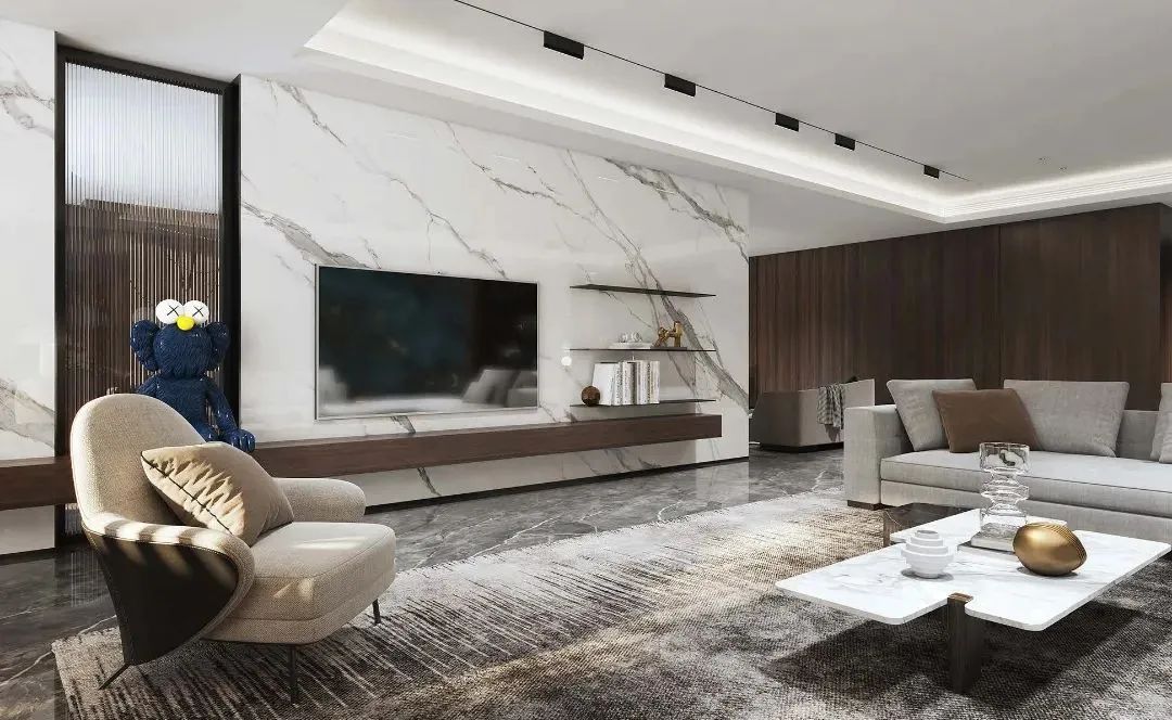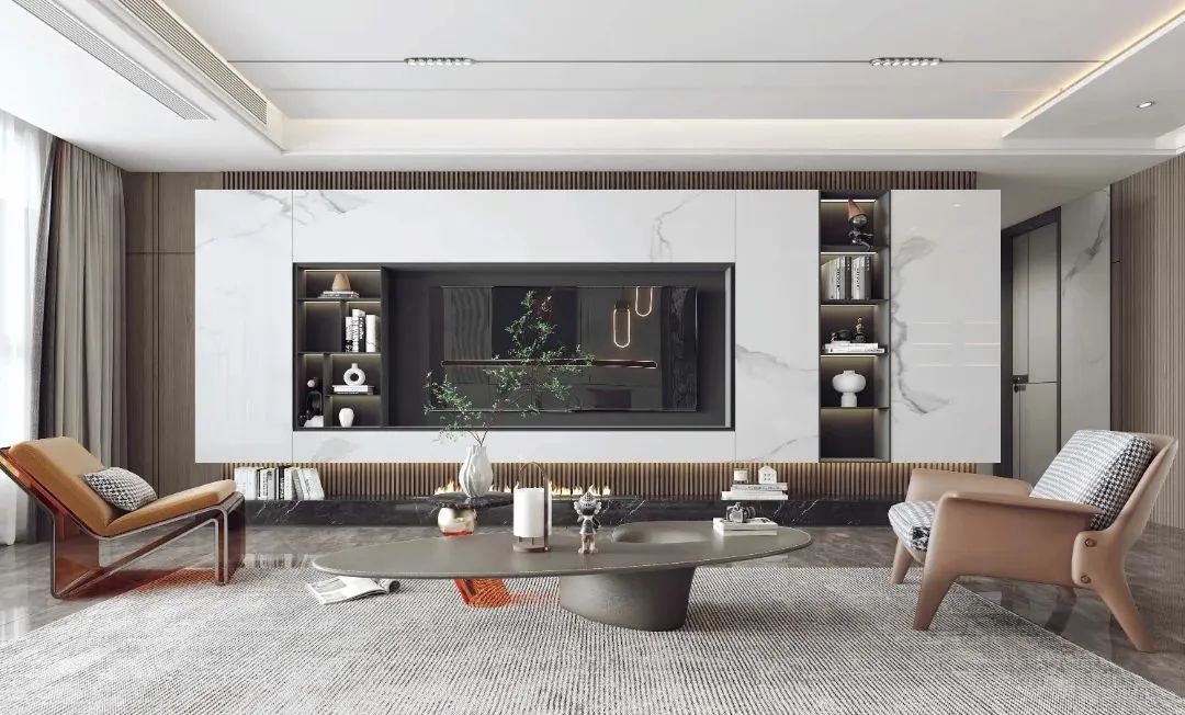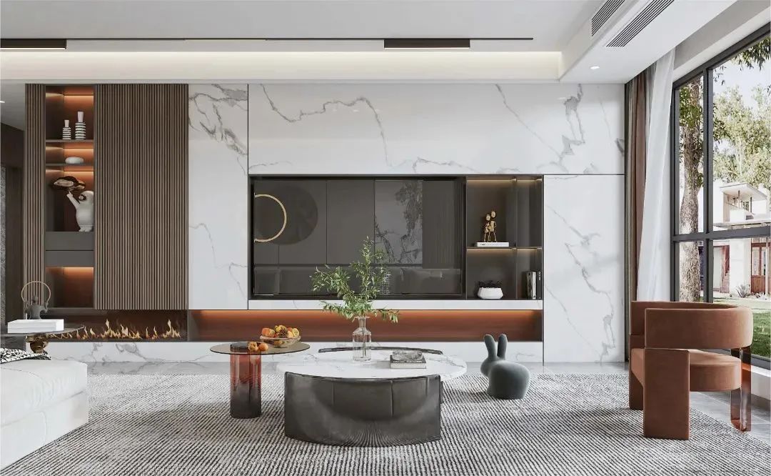 电视背景墙的颜值直接影响客厅的装饰效果,想要营造时尚又不失奢华的视觉效果,石材背景墙当仁不让。石材电视背景墙设计,功能繁多,可储物、可装饰,用在墙面的整体视觉上宽敞明亮,彰显家居环境的大气豪放。追求简约自然的业主可以试试木质+大理石的电视背景墙,可以凭借石材,配合灯带或者装饰展示柜体,美观又舒适。