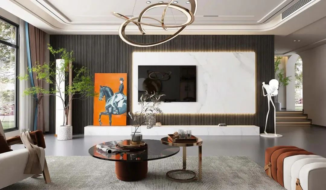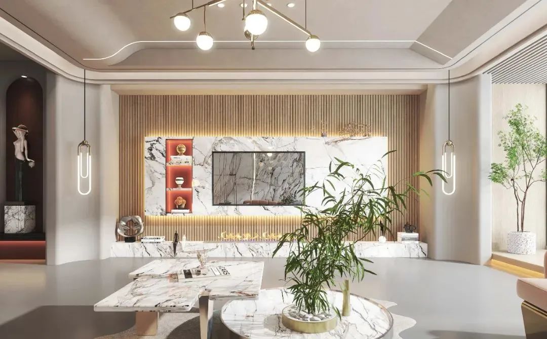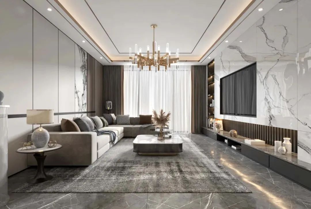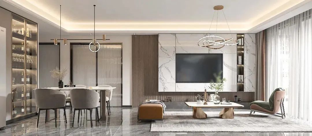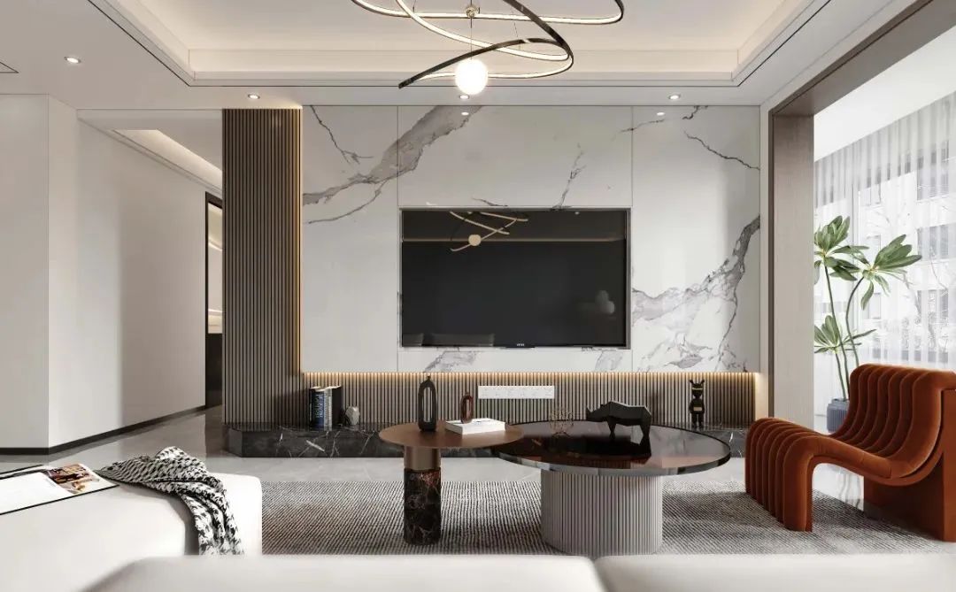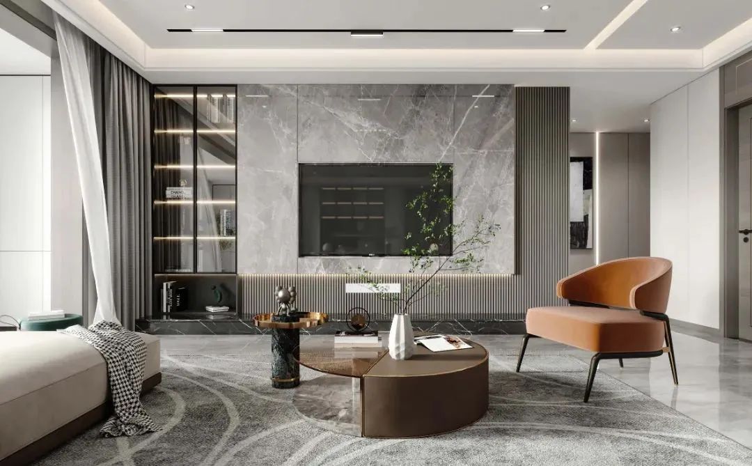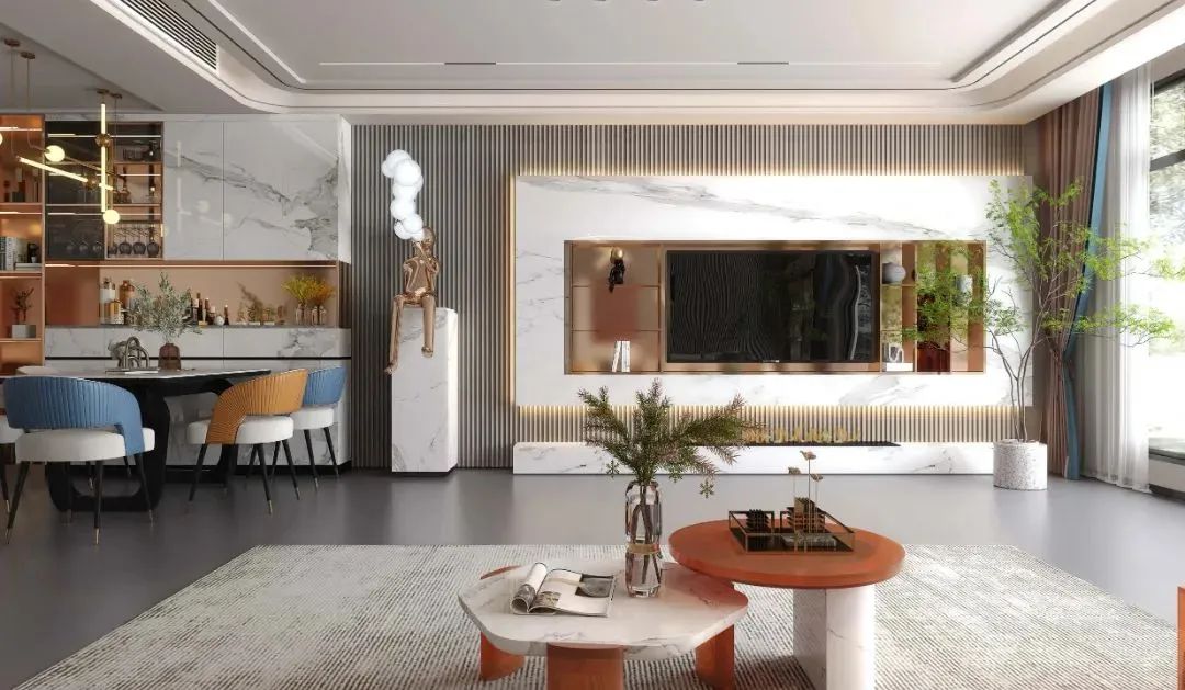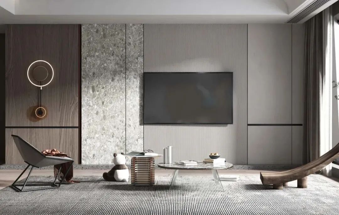 电视背景墙的颜值直接影响客厅的装饰效果,想要营造时尚又不失奢华的视觉效果,石材背景墙当仁不让。石材电视背景墙设计,功能繁多,可储物、可装饰,用在墙面的整体视觉上宽敞明亮,彰显家居环境的大气豪放。追求简约自然的业主可以试试木质+大理石的电视背景墙,可以凭借石材,配合灯带或者装饰展示柜体,美观又舒适。
