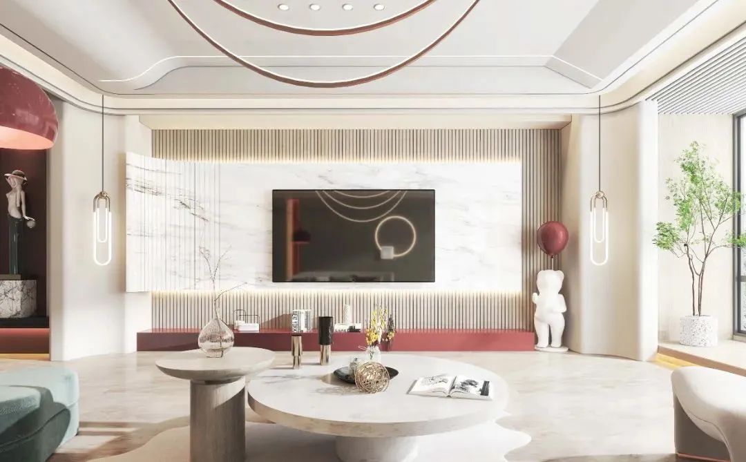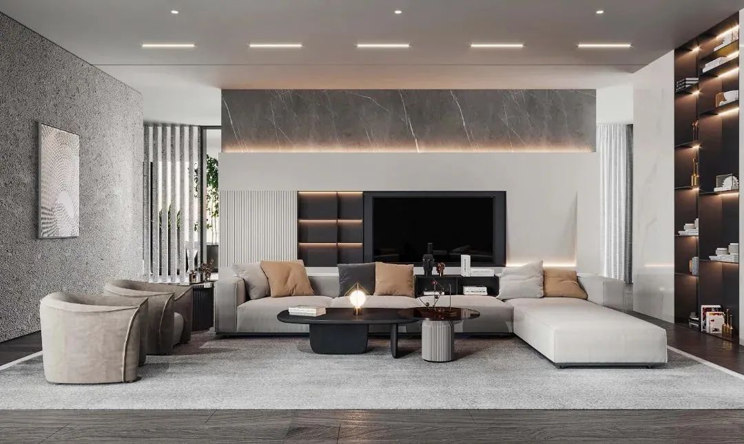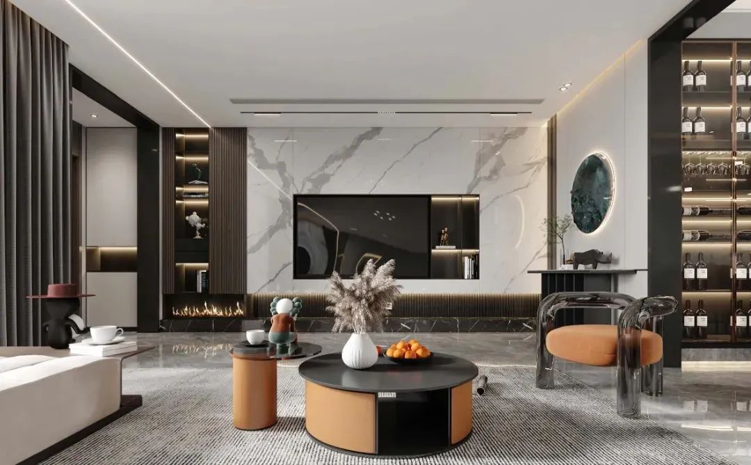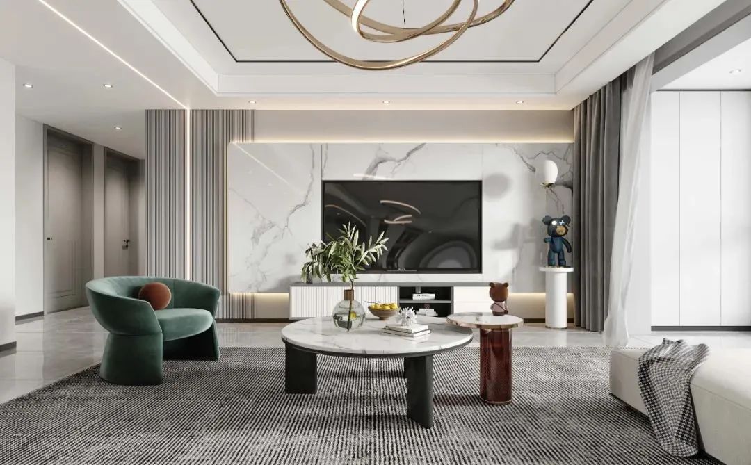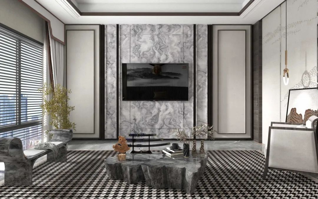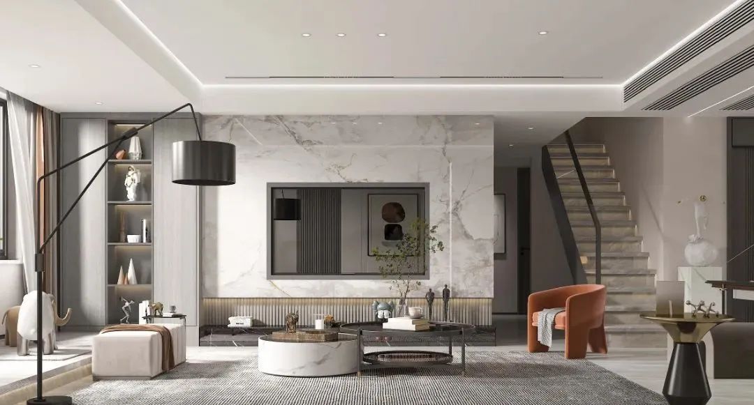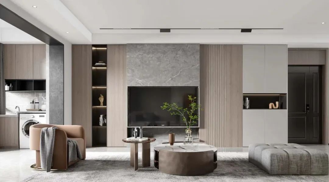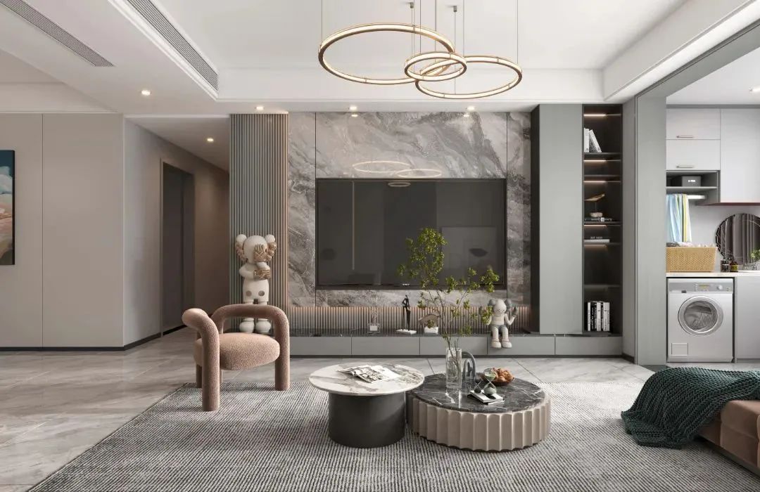 电视背景墙的颜值直接影响客厅的装饰效果,想要营造时尚又不失奢华的视觉效果,石材背景墙当仁不让。石材电视背景墙设计,功能繁多,可储物、可装饰,用在墙面的整体视觉上宽敞明亮,彰显家居环境的大气豪放。追求简约自然的业主可以试试木质+大理石的电视背景墙,可以凭借石材,配合灯带或者装饰展示柜体,美观又舒适。
