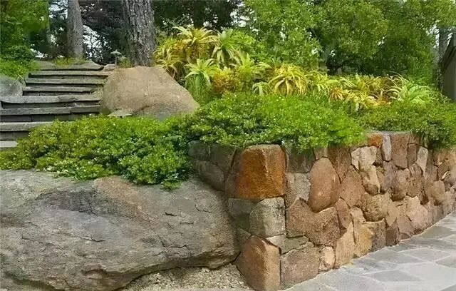 园林设计的一个要素,利用不同大小、形状的石块搭砌挡土墙,可以用在花园的不同区域。如果想在这个区域让人感觉很放松,可在石头中间种植些植物,营造出温馨的氛围。