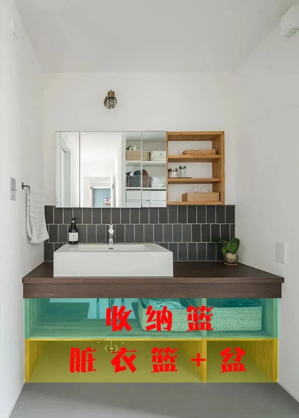 每个区域的收纳重点都不一样,台盆区需要收纳护肤品、牙刷、毛巾、面盆等