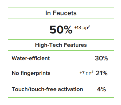今年,最多的受访者更换了浴室的水龙头,达到87%。而在更换水龙头的受访者中,50%用上了高科技水龙头,是所有卫浴产品中科技趋势最明显的产品。功能方面,高科技水龙头中的节水产品最受欢迎,选用率达到30%,其次是表面不留指纹的产品(21%)和非接触产品(4%)。