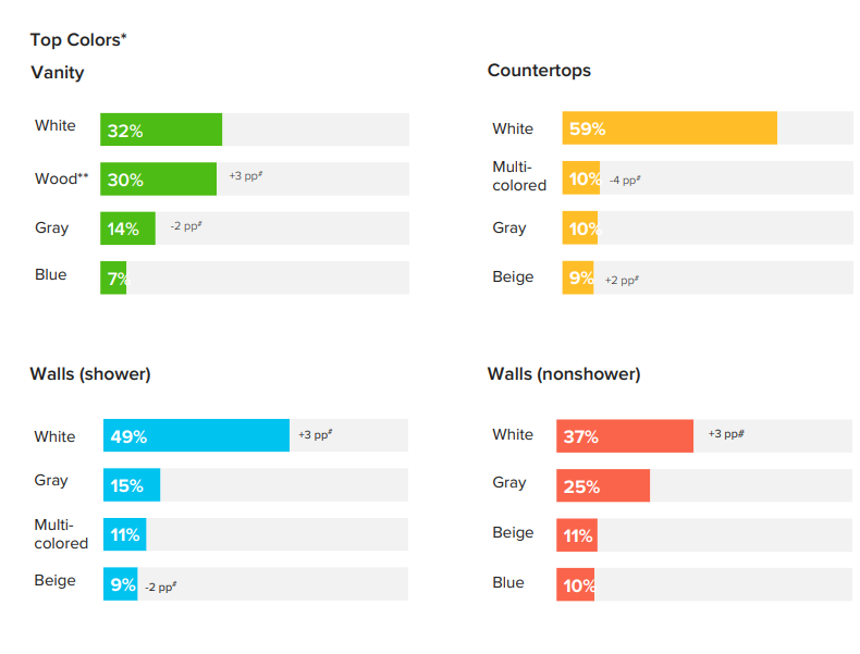 无论在浴室柜、台面、墙壁或地面,白色依然是浴室里的主流颜色。其中,选用白色墙壁的受访者达到49%,大幅领先灰色(15%)、彩色(11%)和米黄色(9%);选择白色地板的受访者也增加了3个百分点至37%。浴室柜方面,虽然白色依然是主流(32%),但排名第二的原木色比例今年增加了3个百分点至30%,有赶超白色的势头;台面方面,依然是白色占最大优势,选用率达59%,其他颜色的选用率仅有10%左右。