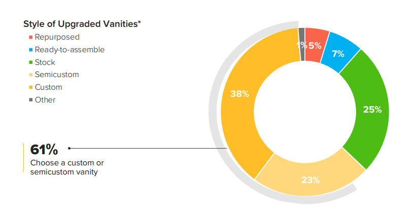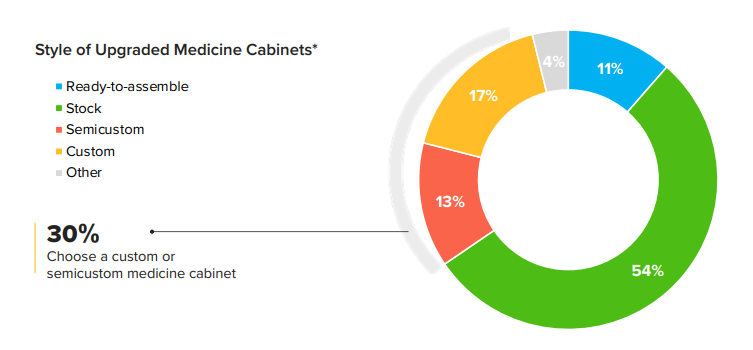 在升级了浴镜的受访者中,60%扩大了其收纳空间,多于选择升级可定制产品(30%)的人。在升级了浴镜收纳空间的受访者中,66%选择了镜子外围有置物空间的产品,36%选择了内置空间的产品,比例均与去年持平。此外,在升级浴镜的受访中,还有21%选择了带照明的产品。