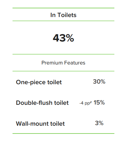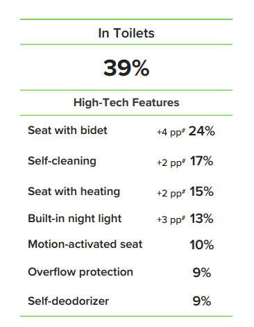 今年,智能马桶在美国市场的渗透越发明显。在更换马桶的受访者中,39%选择了智能马桶。对于智能马桶的功能,按受欢迎程度依次是喷嘴(24%)、自洁(17%)、座圈加热(15%)、夜灯(13%)、自动翻盖(10%)、防溅水(9%)和自动除臭(9%),其中前四项功能的受欢迎程度比去年均增加2-4个百分点不等。