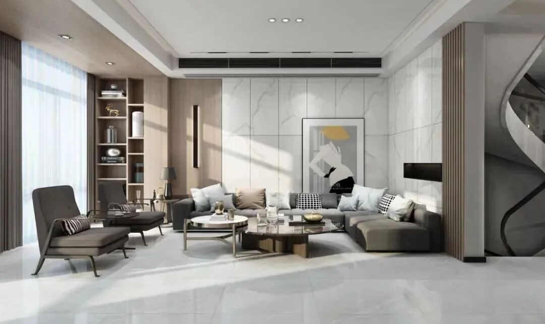 3、黑白灰瓷砖。黑白灰是我们客厅地砖经常见的一种颜色,白色可让客厅变得更加明亮通透,可以和客厅中其他颜色进行搭配。灰色充满着艺术气息,深受许多家装设计师的喜爱,可让客厅显得更具优雅。而黑色地砖可以用来点缀,让客厅更具空间装饰感。