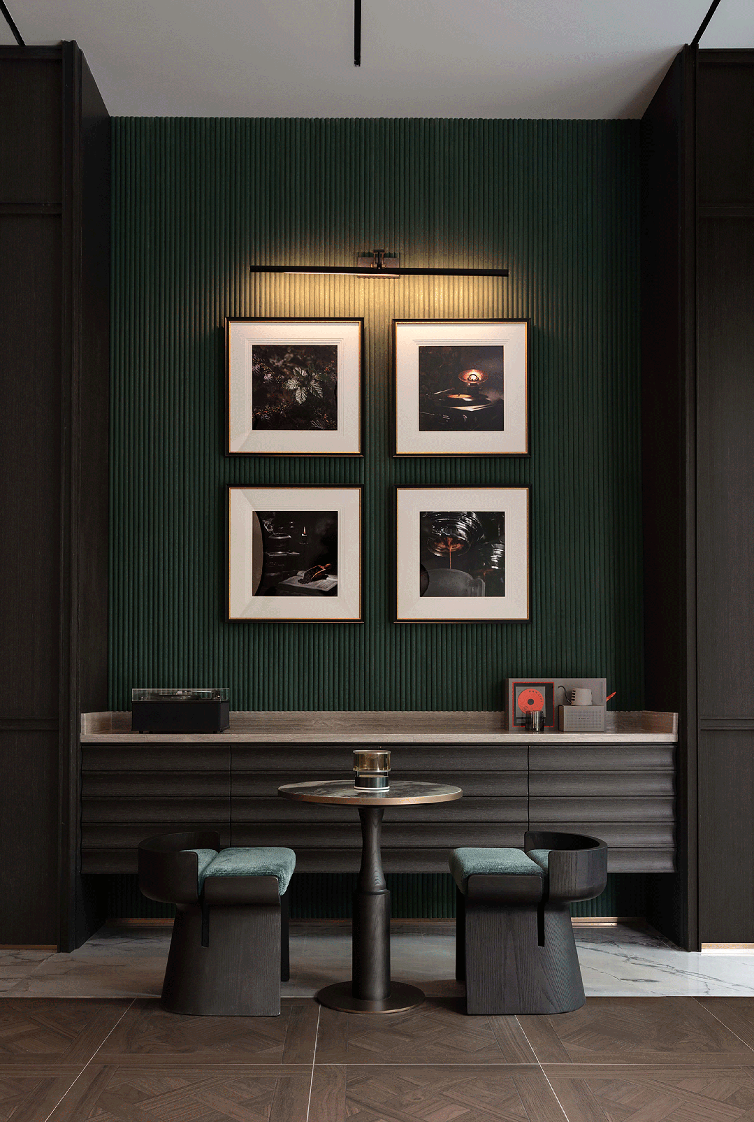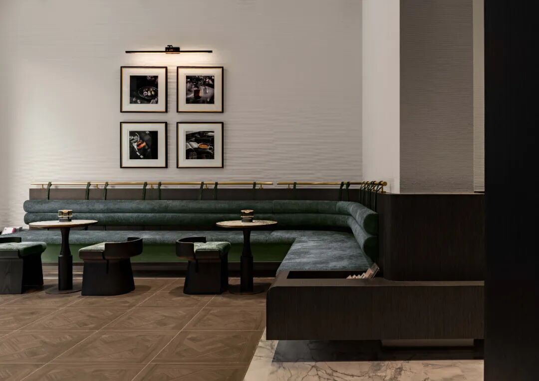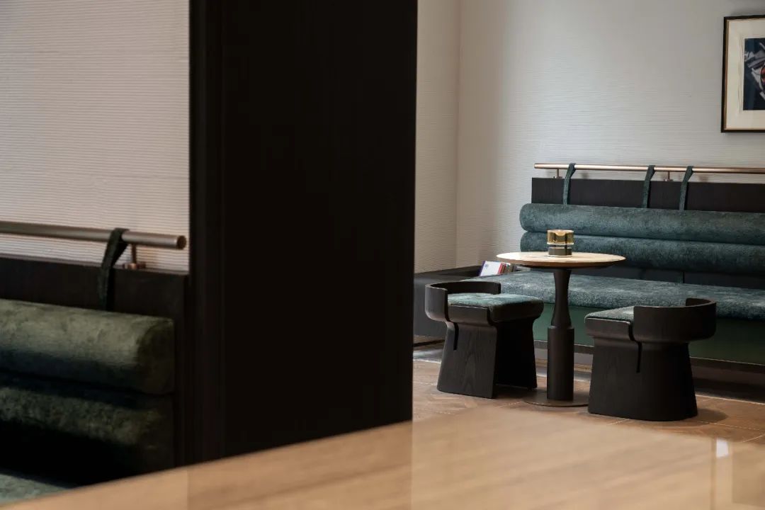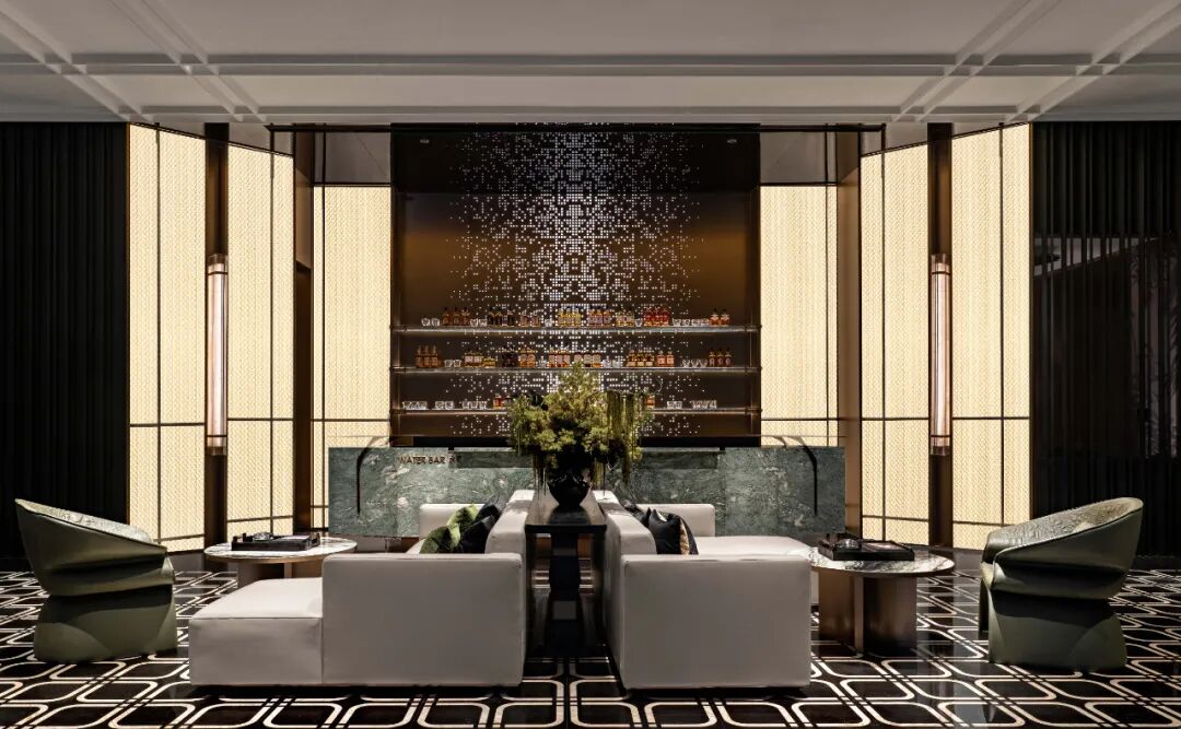 洽谈水吧区以中轴对称的阵列布局,呈现出硬朗沉稳的仪式感。斑驳的点点星光透过金属冲孔板映照其间,沿着中轴向外晕染,通过精致主义的演绎,诠释出东方情韵的古典美学。翡翠绿奢石的水吧台,以另一种极致的简约,潜入东方。
