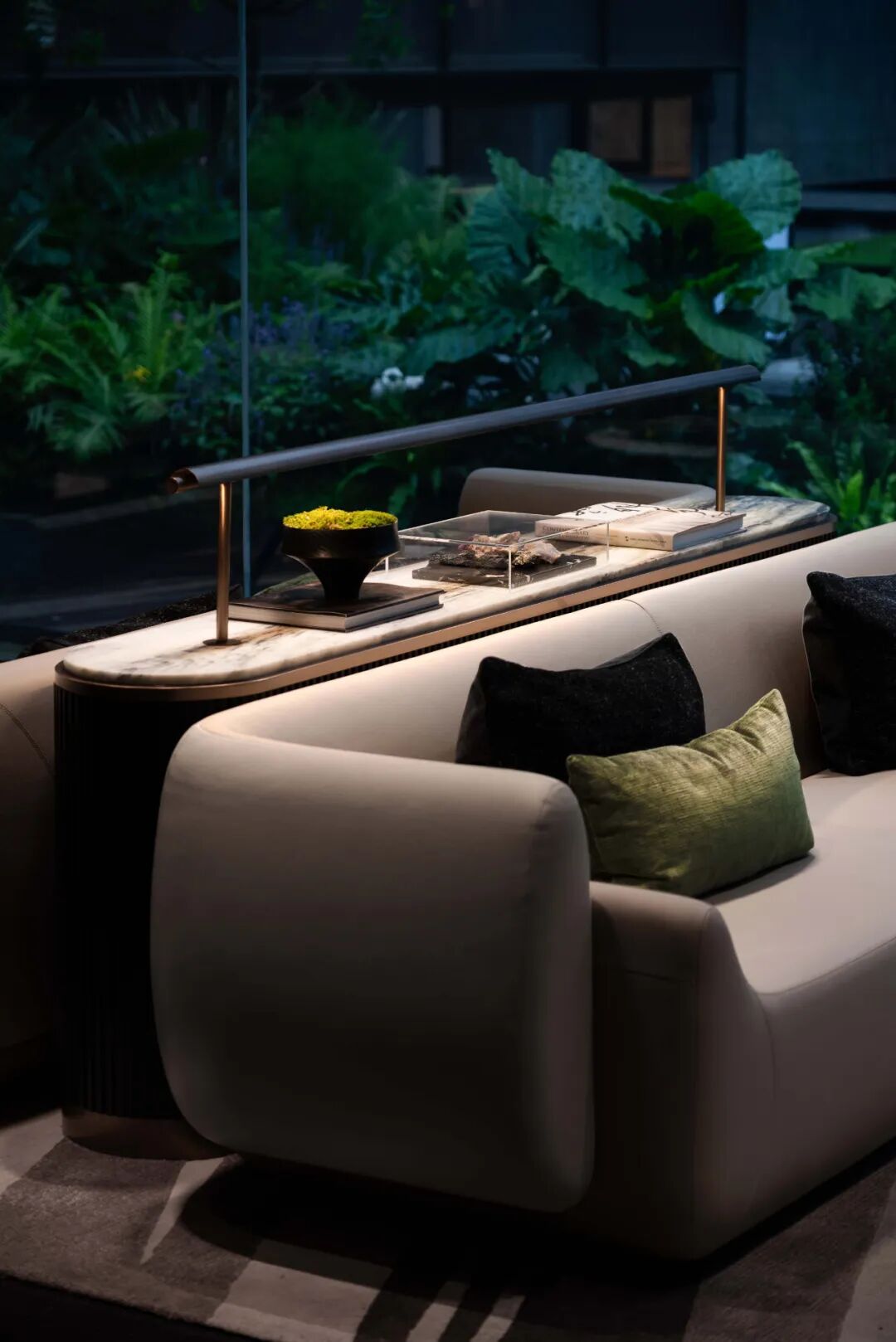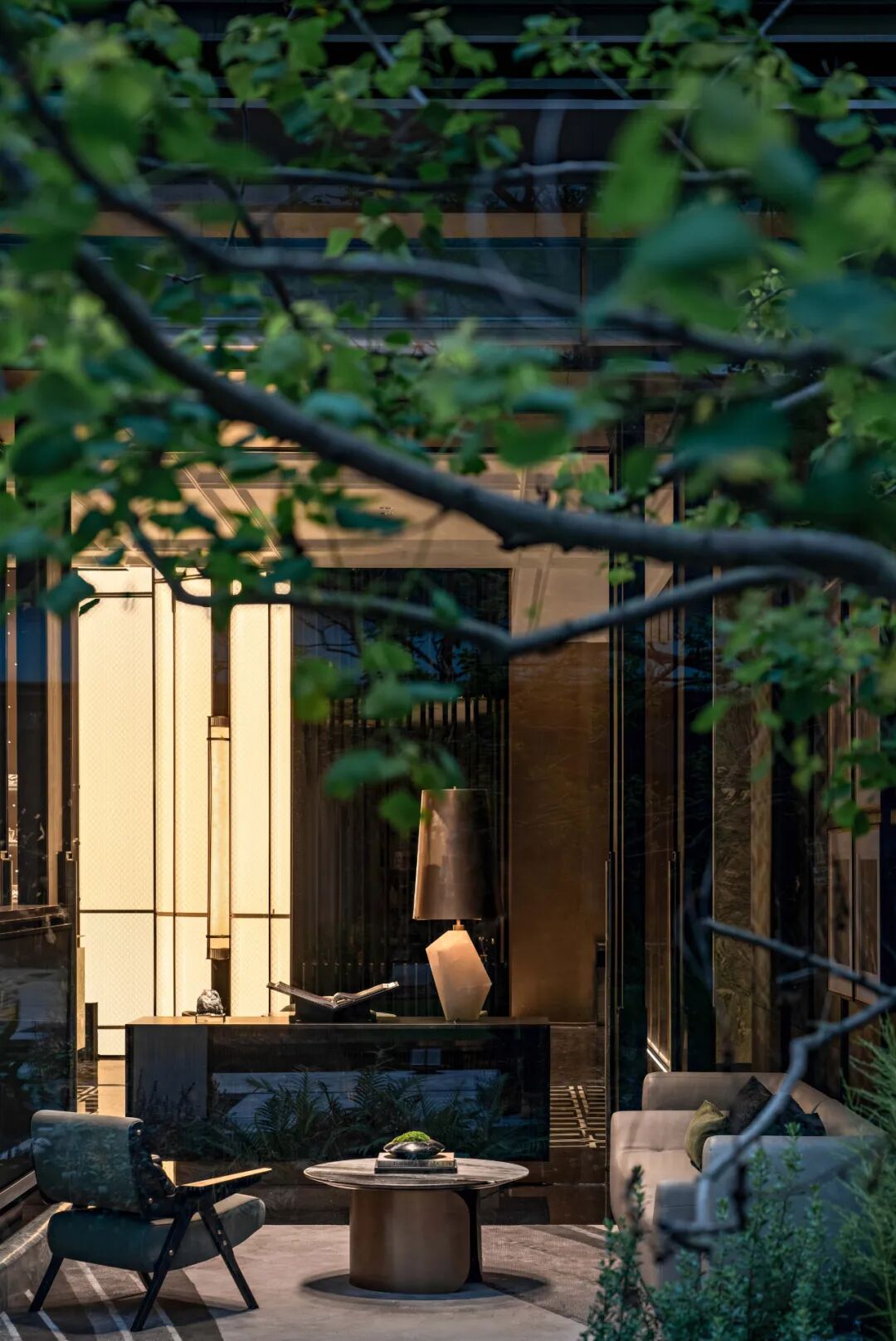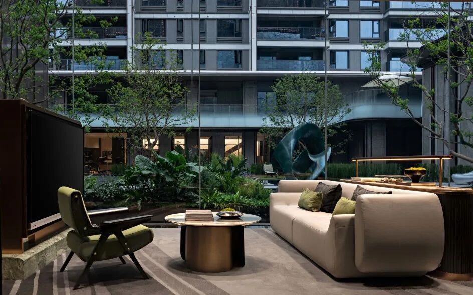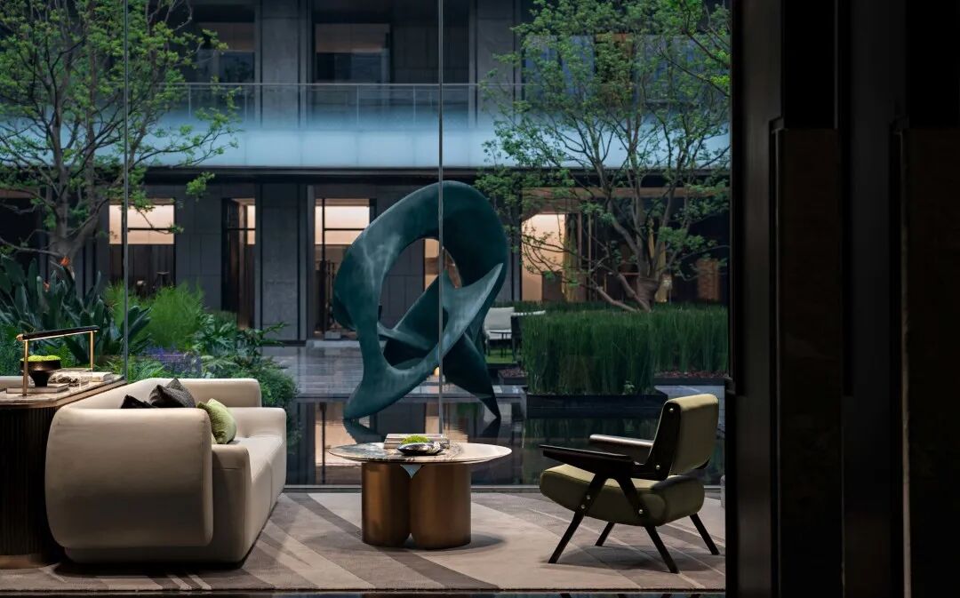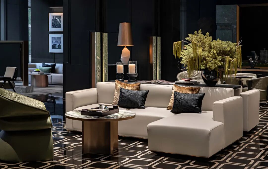 深恰区以一重端景间隔,止于喧嚣,回归静谧,温润而充满诗性的东方格调围绕着户外景观庭院徐徐展开,以水纹为肌理融入地毯的配色中,仿佛一幅优雅舒展的画卷,将点滴山水注入室内,为整个空间带入清隽盎然的美学韵律,内外皆为境。