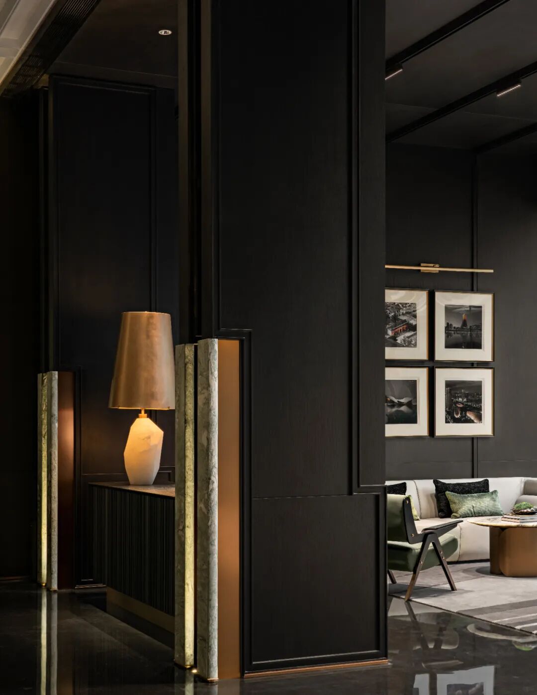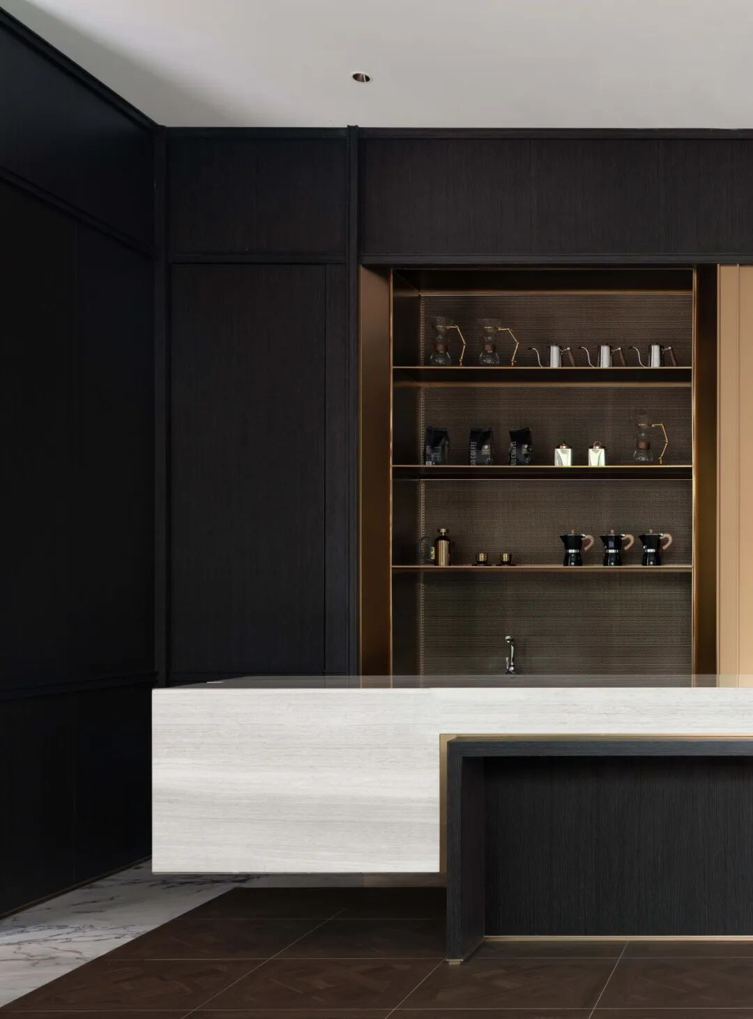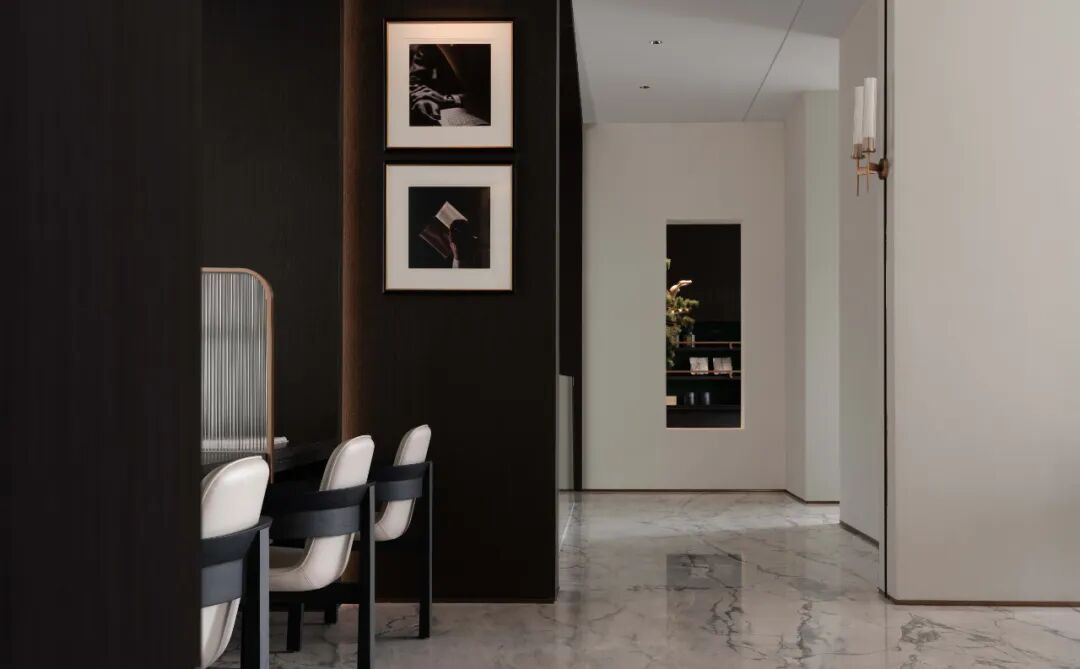 水吧区以极简主义的设计审美呈现出轻盈的时尚感,简约的白色暗纹大理石吧台,以一体式的切割手法形成删繁就简的高级感。黑与金的搭配象征着神秘与力量,通过深色木饰面赋予空间质感,搭配纵向拉伸的金属线条酒柜,形成材质之间的强烈碰撞,为都市新贵呈现一处私享栖息地。