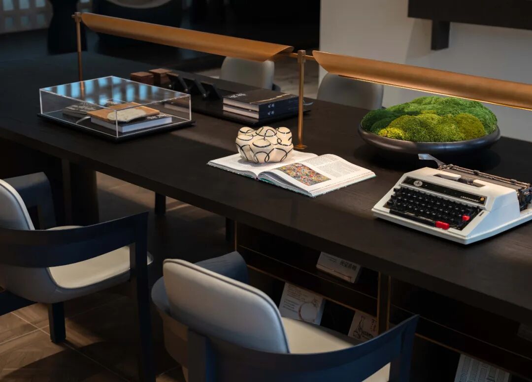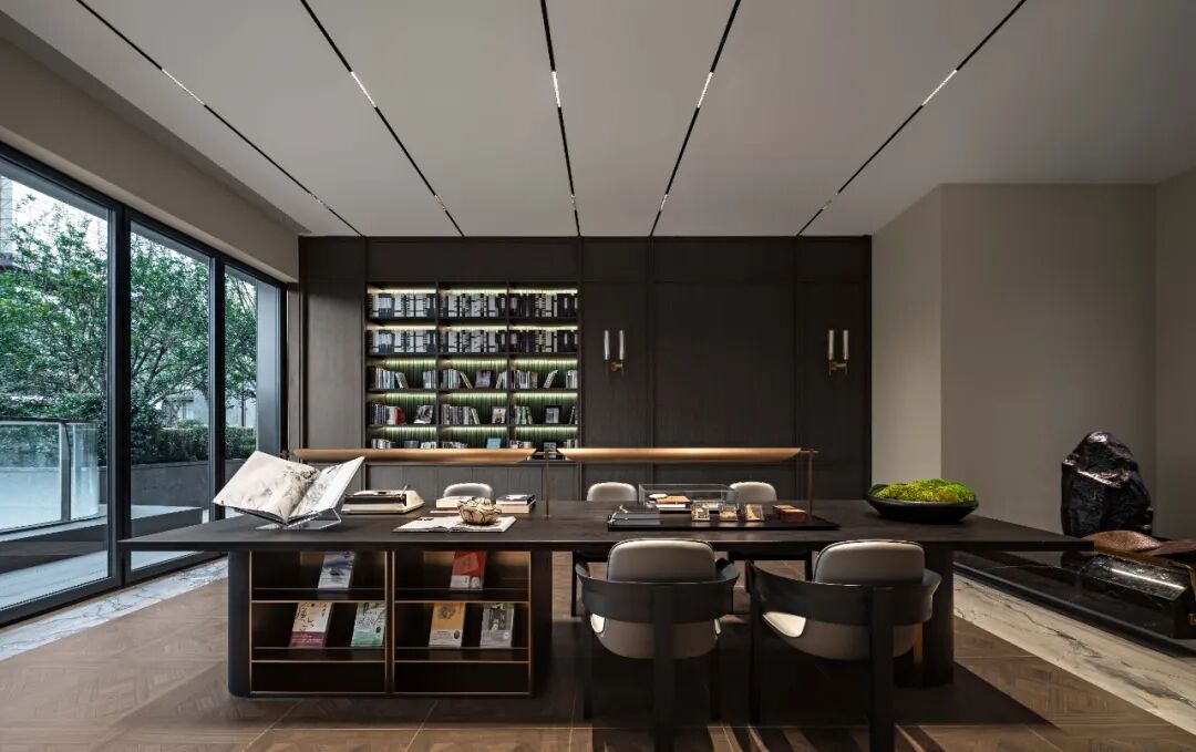 阅读区临窗而设,在深色的框景下,更显静谧和舒适的氛围,单人阅读位的设计,形成较为私密互不打扰的体验感。朦胧的玻璃材质透光而不透景,联排的设计创造了诗意的视觉统一。