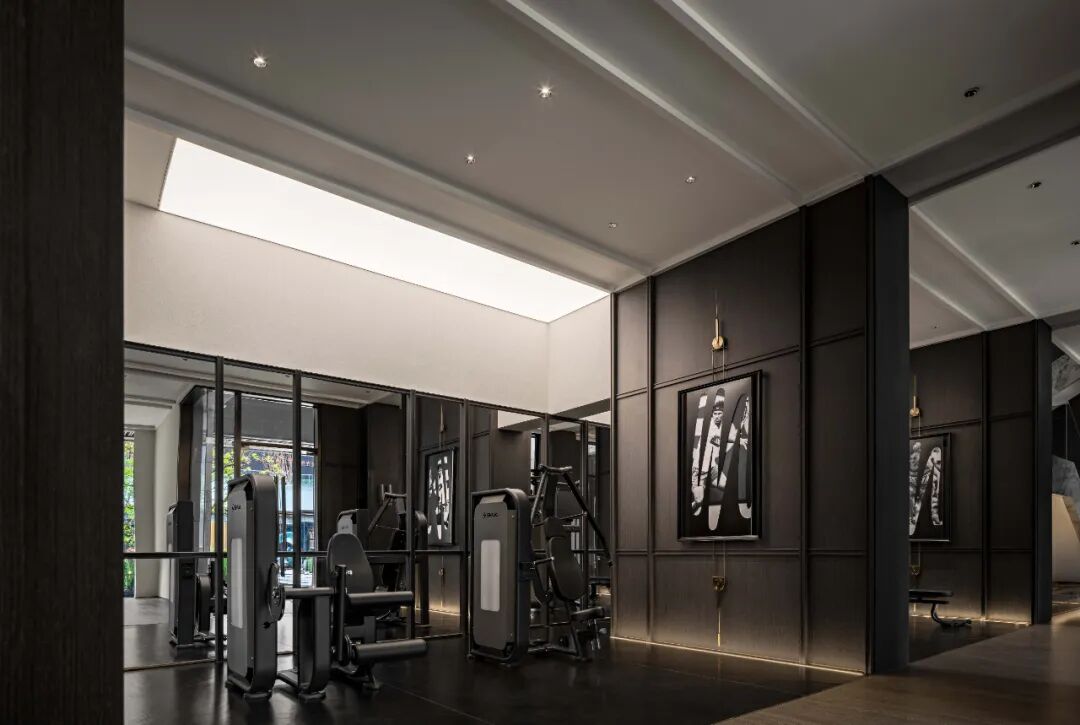 沿着几何线条的艺术阶梯,来到健身区,宽敞合理的功能分区为都市新贵营造出舒适的运动氛围,大面积落地玻璃的设计将自然光景引入室内,辅以明亮的灯光,让空间充满活力和能量。每个区域都配备了抽象艺术画,将艺术与运功相结合,沉浸式感受健身的魅力。