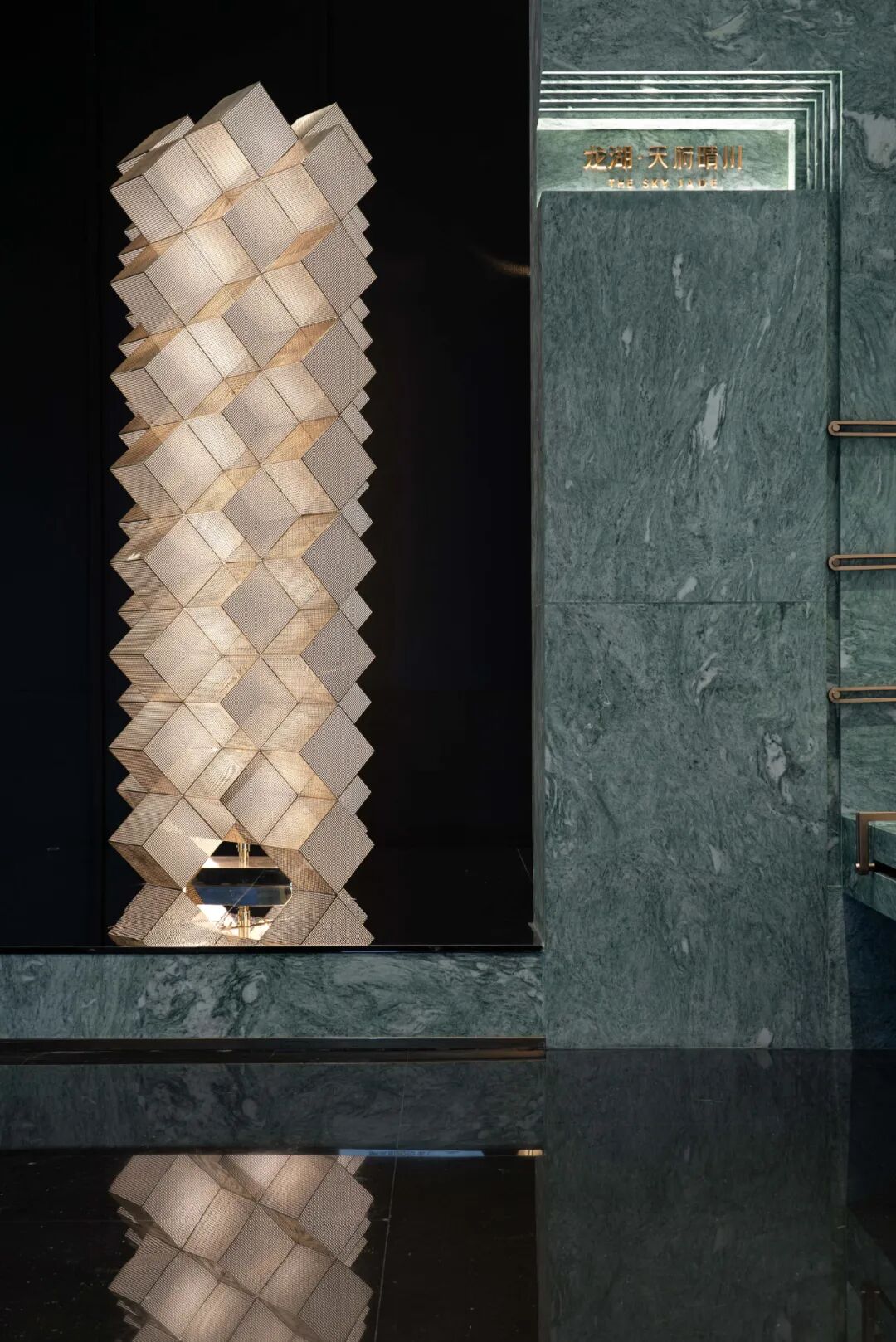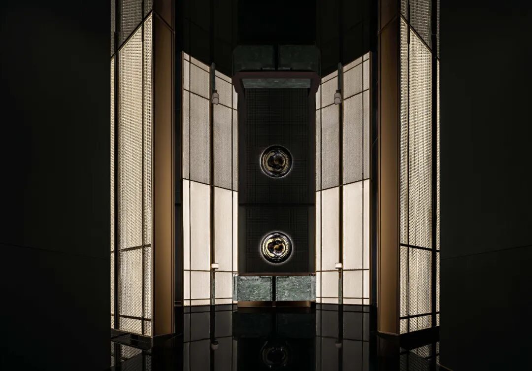 石头在古蜀的神话传说中具有神秘的力量,初入序景,一幅承启天地的镜石艺术装置赋予了空间震撼的视觉享受,采用中轴对称式的构图,彰显出东方礼序。