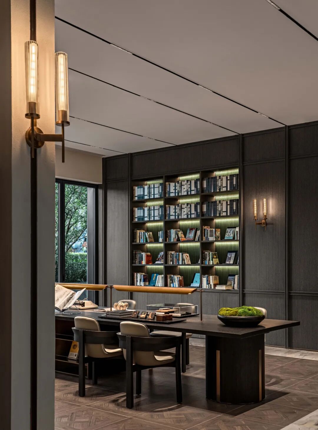 在慢调时光里,徜徉书海中。将阅读融入自然之中,书吧以方正的格局让每个阅读位都能享受到自然光景。整个空间选用深色木饰面,搭配金属壁灯增加细节的层次感,给人以沉稳、宁静的氛围,明确的功能分区为阅读带来便利。