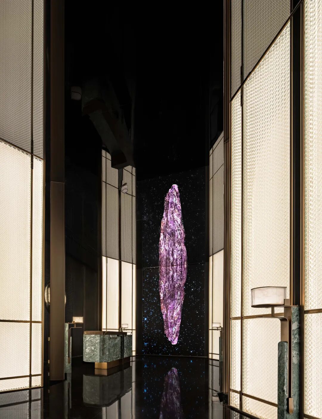 动态的艺术绘画通过镜像的形式表达出空间的仪式感,融汇成都丰富的矿石元素。晶体矿石经过岁月的打磨和沉淀才得以形成,如同麓山板块,从无到有经历岁月流转,这既是对时代的致敬,也承载着对未来美好的期许。