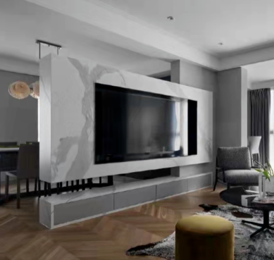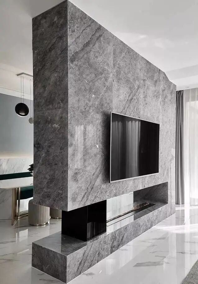2、铺贴面层装饰不管面层装饰是瓷砖、石材还是木饰面,可以使用结构胶直接进行铺贴,遇到拐角,使用折边工艺收口即可。结构胶强度高,能够承受较大荷载,耐老化、耐疲劳、耐腐蚀,性能稳定,适用于承受强力的结构件粘结,这是保证面层装饰不脱落的“秘密武器”。注意事项1、提前规划好电视墙造型,确定各个插座孔的位置,以便于施工的时候进行线路改造和基层处理。2、用石材打造的电视墙,基层最好选用欧松板打底。3、电视墙造型材料可以混合搭配出自己想要的效果。4、如果要设计嵌入式电视一定要提前将电视尺寸确定好,以便师傅现场留出恰当的位置。5、基层处理可以在背景墙隔板上面用钢钉钉上一块龙骨,再钉一个隔板框架,增加牢固性。6、有些地方师傅会选择干挂的方式安装石材,利用钢材挂件将石材安装在墙面,这种方法通常用在室外墙面装饰,室内比较少,干挂无法做嵌入式造型,而且固定挂件比较占用空间,还是比较有局限性。小户型家庭使用胶粘法贴石材就足够了。