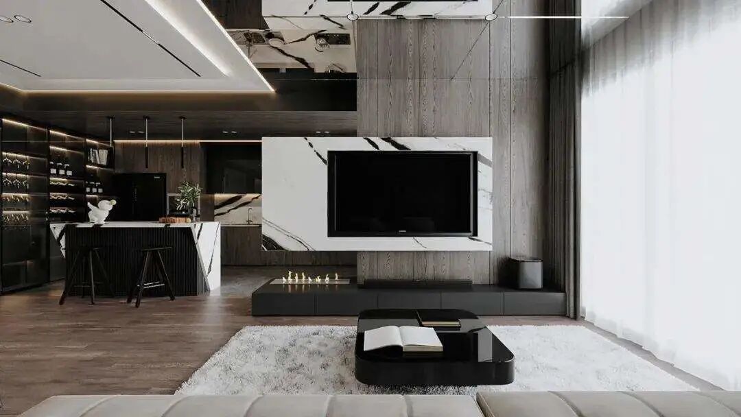 所谓悬空电视墙,就是在电视背景墙中间位置安装突出墙面5-10cm的造型,可以利用瓷砖、大理石、岩板或者木饰面做装饰,周围可再加上灯带增强氛围感。