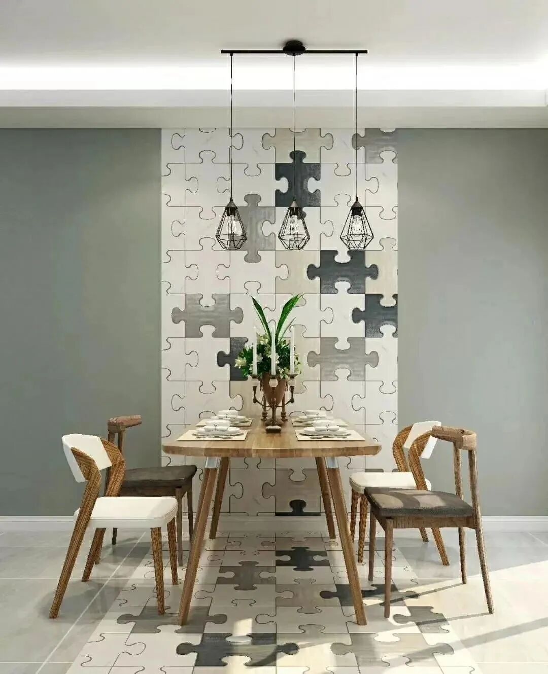 拼图玩过吧,这种拼图纸跟拼图相差无几,搭配于餐厅处能有效的点缀空间,为就餐环境增色不少。