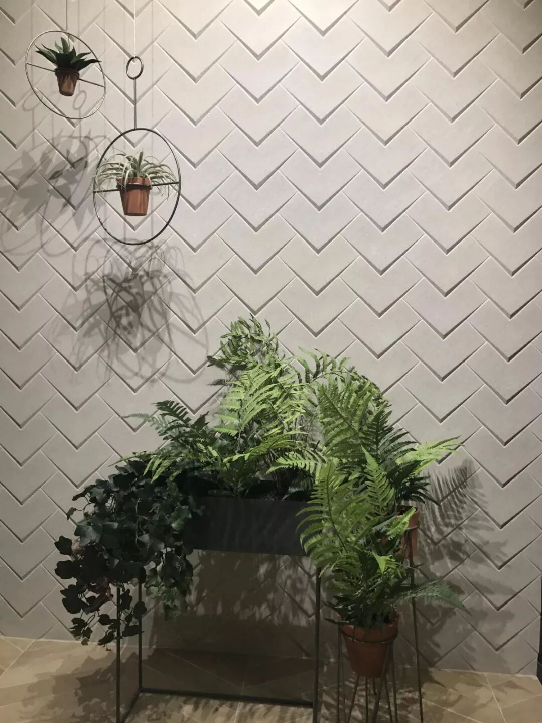 因形状像羽毛而得名,颜色选择多样,也可以采用多种颜色拼接。羽毛砖多用于墙体上,整体紧密相连,视觉上较轻盈,充当沙发背景墙是个不错的选择
