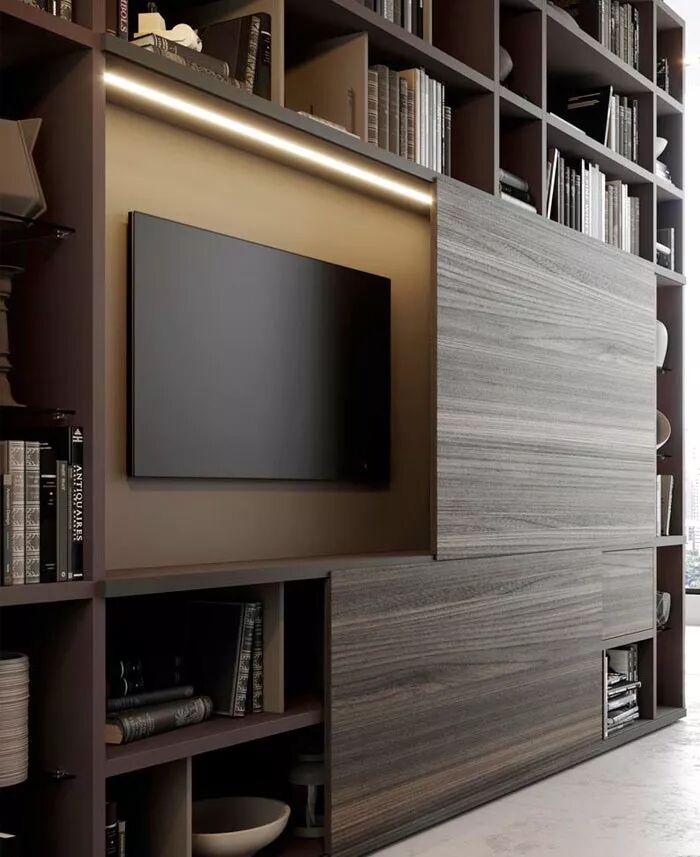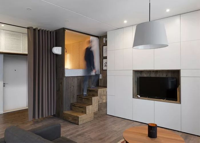 为电视组装一个特定的壁龛,其余空间用选定的材料(木材、胶合板、层压板或单板)覆盖,提前规划好需要的收纳空间,对于小户型来说非常适合。