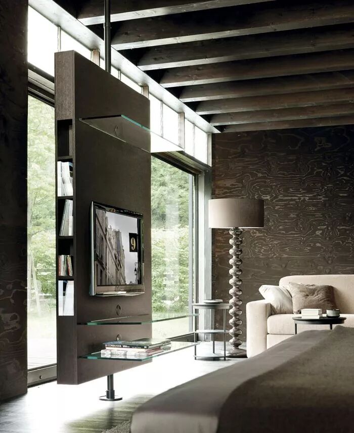 收纳之外,玩个更加高级的——"藏起来”。给你的收纳柜们额外加一个可以隐藏或显示电视屏幕的滑动面板。