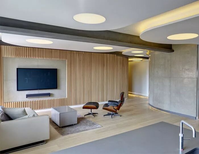 这两个例子,给我们展示了现代极简主义感的电视墙设计。